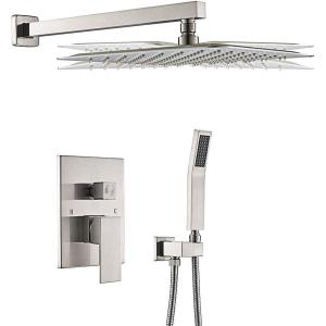 Shower Faucet Set Matte Black Shower System, 12″ Ceiling Rainfall Shower and 8″ Wall Mount Rain Shower with 2 in 1 Handheld, Can Use All at Once, Pressure Balance Rough-in Valve and Trim Kit(Brushed Nickel)