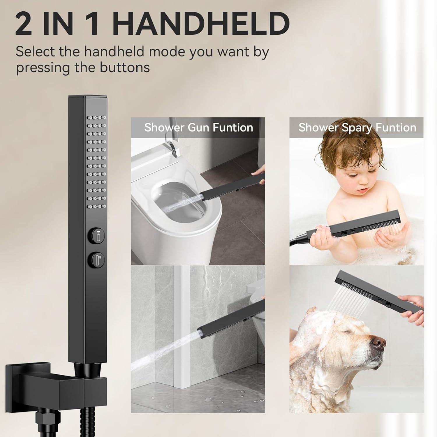 Complete Shower System Included: This shower faucet set includes everything you need for a luxurious upgrade:12 inch and 6 inch Square Rain Shower Head (304 stainless steel) with Shower Arm (Brass), 2 Modes Handheld Spray(Brass), Shower Holder (Brass), 60-inch Shower Hose (304 stainless steel), Thermostatic Valve (Brass), Our product brass content is higher than others, corrosion-resistant and more durable