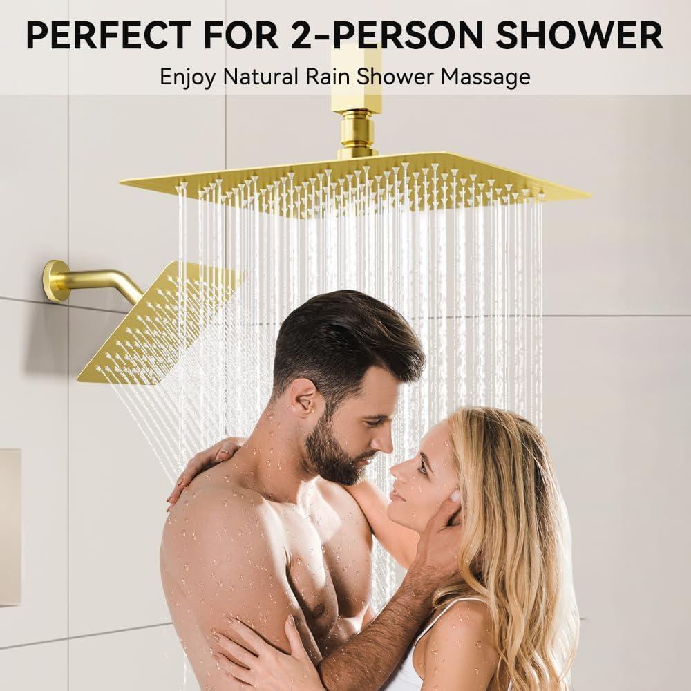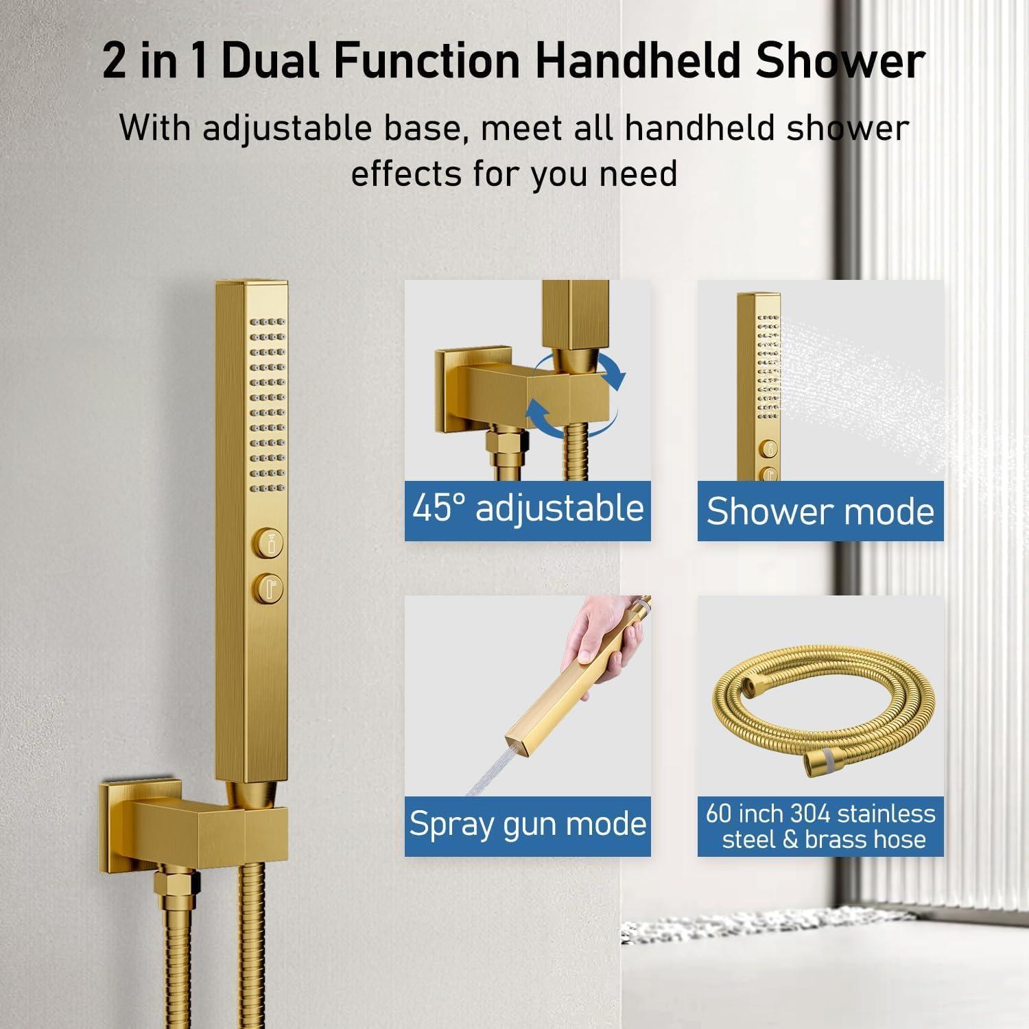 Complete Shower System Included: This shower faucet set includes everything you need for a luxurious upgrade:12 inch and 6 inch Square Rain Shower Head (304 stainless steel) with Shower Arm (Brass), 2 Modes Handheld Spray(Brass), Shower Holder (Brass), 60-inch Shower Hose (304 stainless steel), Thermostatic Valve (Brass), Our product brass content is higher than others, corrosion-resistant and more durable