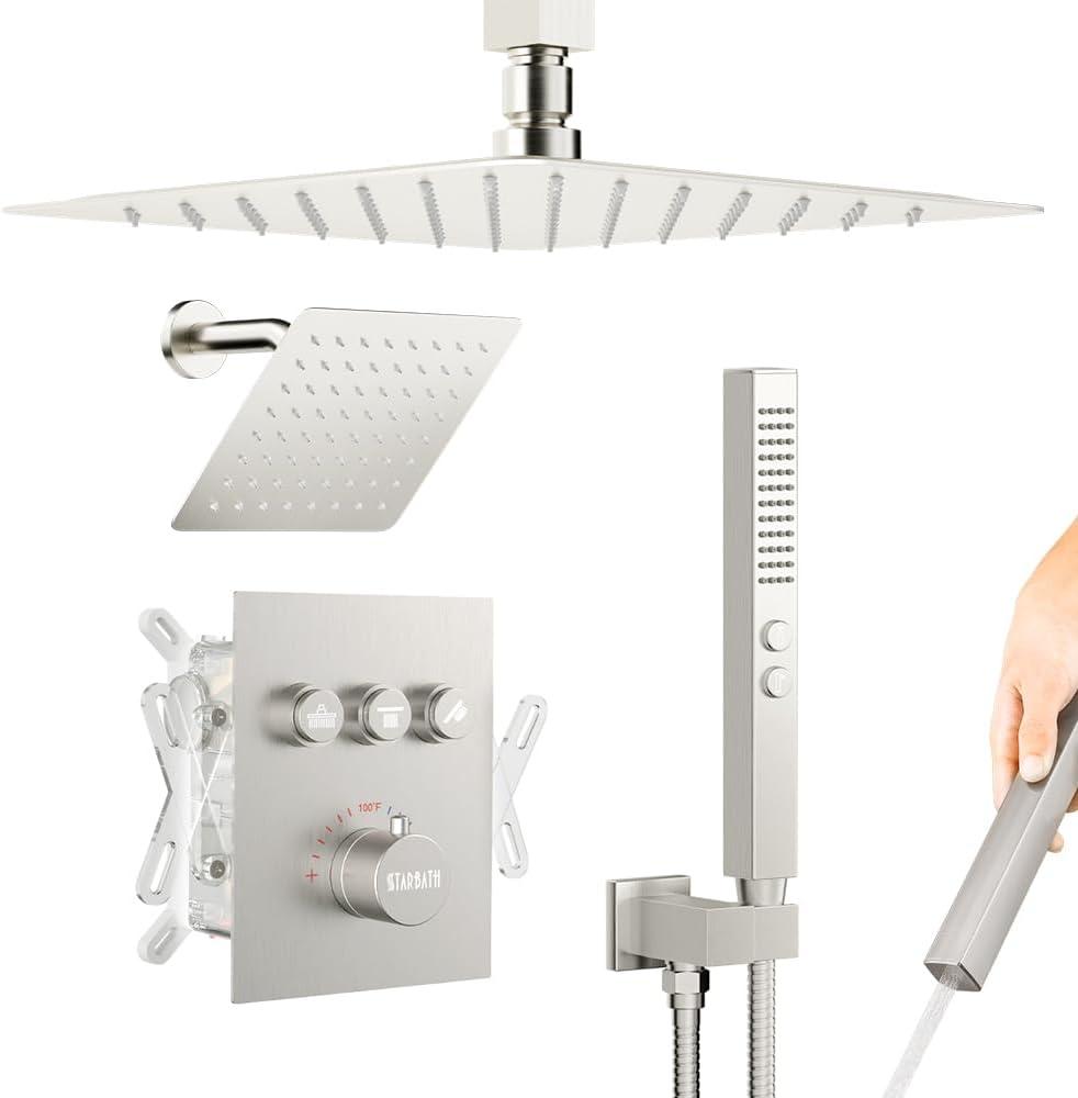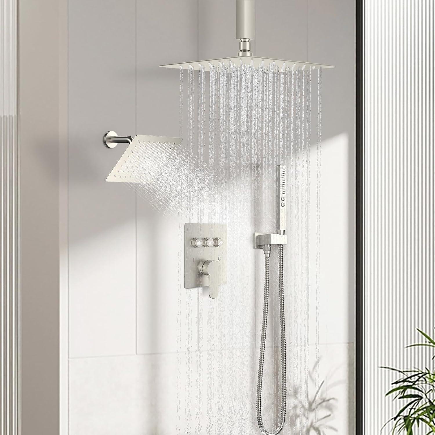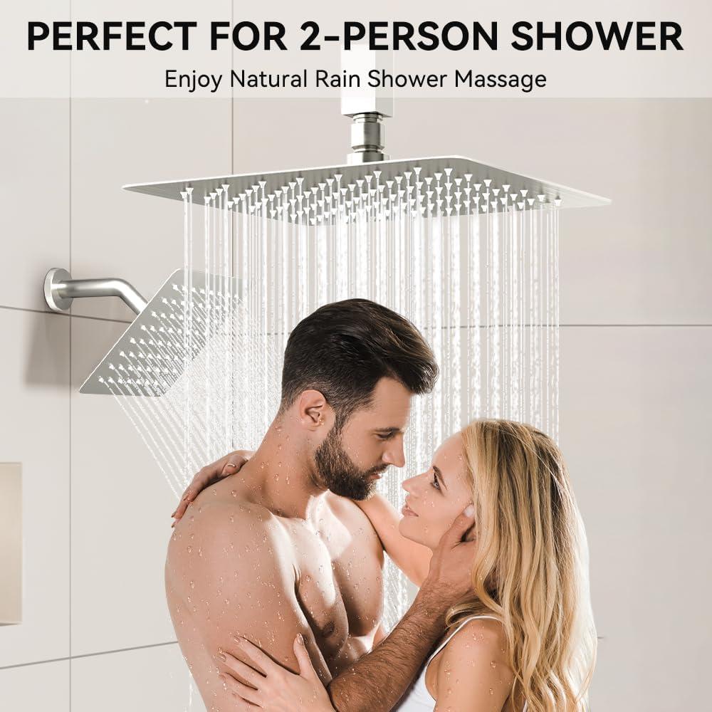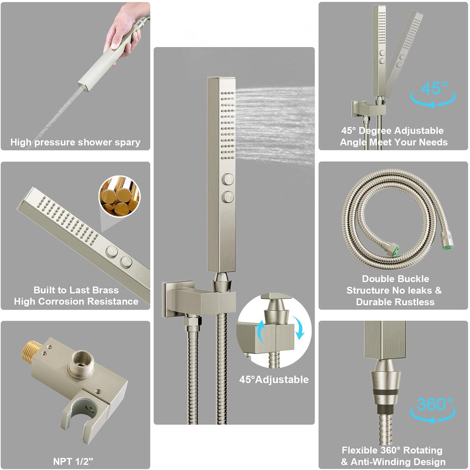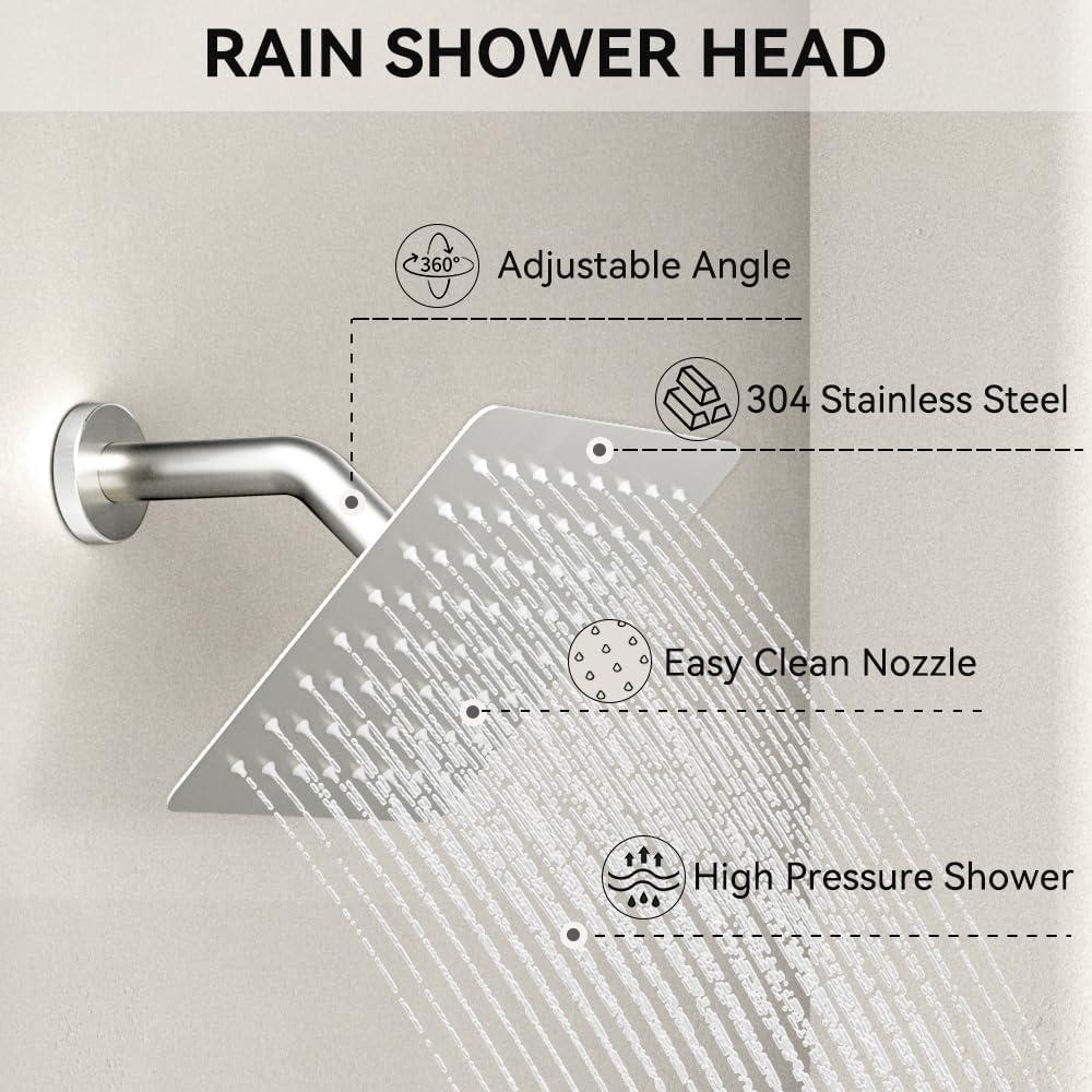 High Quality: The rainfall shower system is of all-metal construction. Composed of solid brass and stainless steel, it offers excellent rust resistance and long life.304 Stainless steel rain shower head with silicone nozzles easily cleans mineral residue and ensures that the showerhead maintains good water output over time.