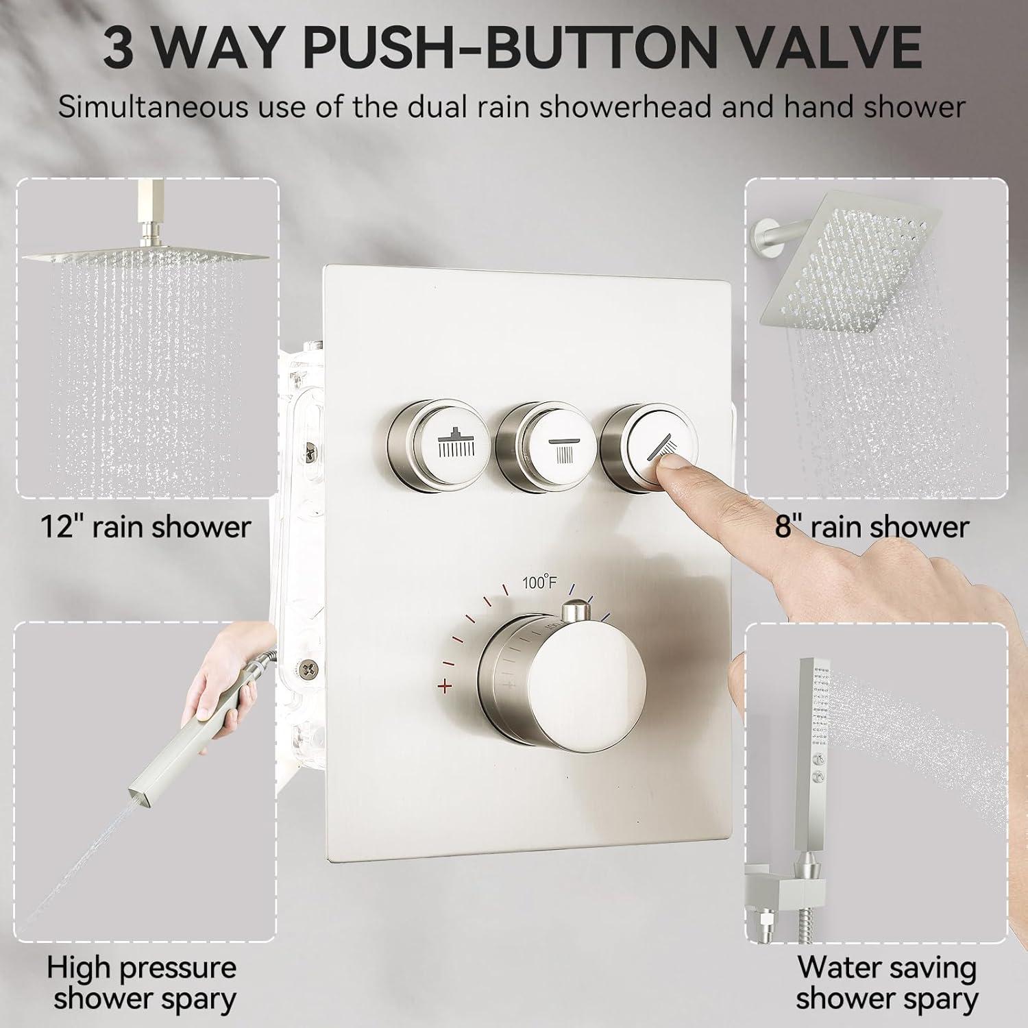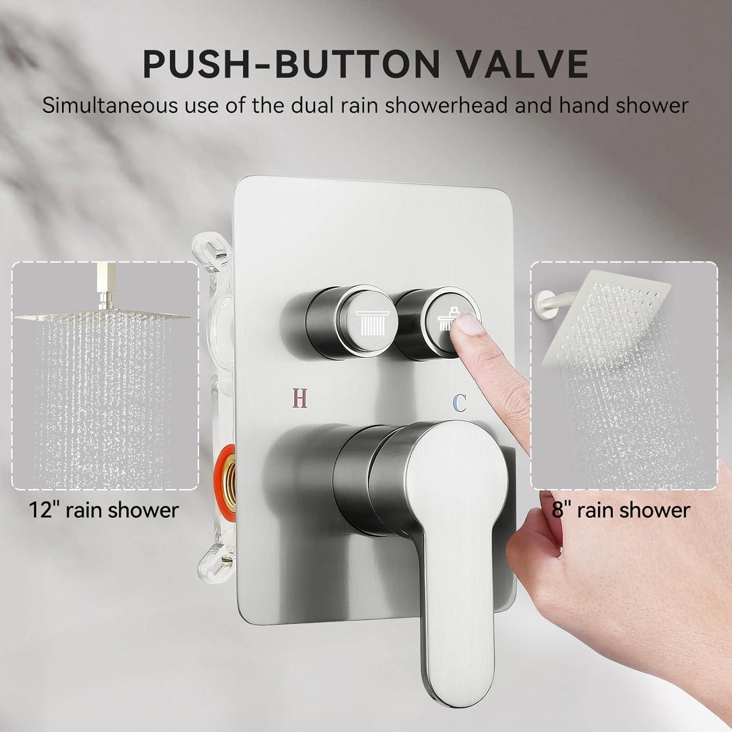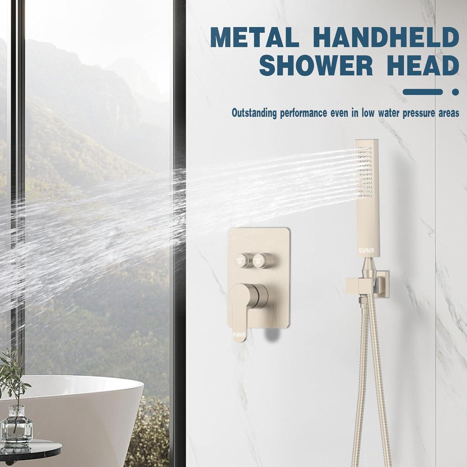 Rainfall Shower System, 10 inch Wall Mounted Rain Shower Head with Handle Set, Push Button Diverter 2 Functions Simultaneous Use,High Pressure Shower Faucet Set with Rough-in Valve, Brushed Nickel(Brushed Nickel)