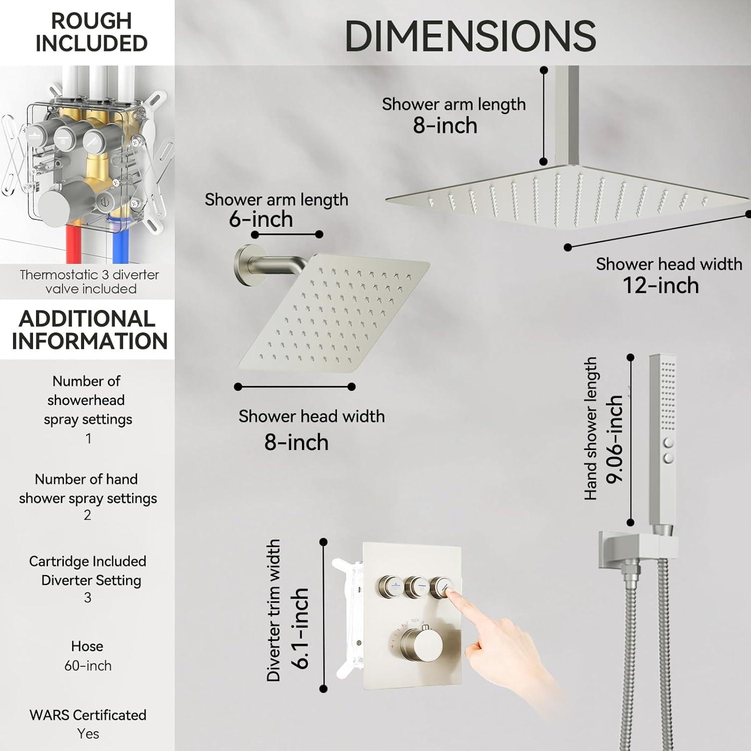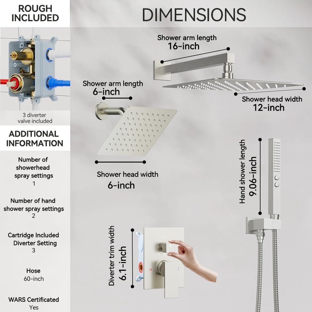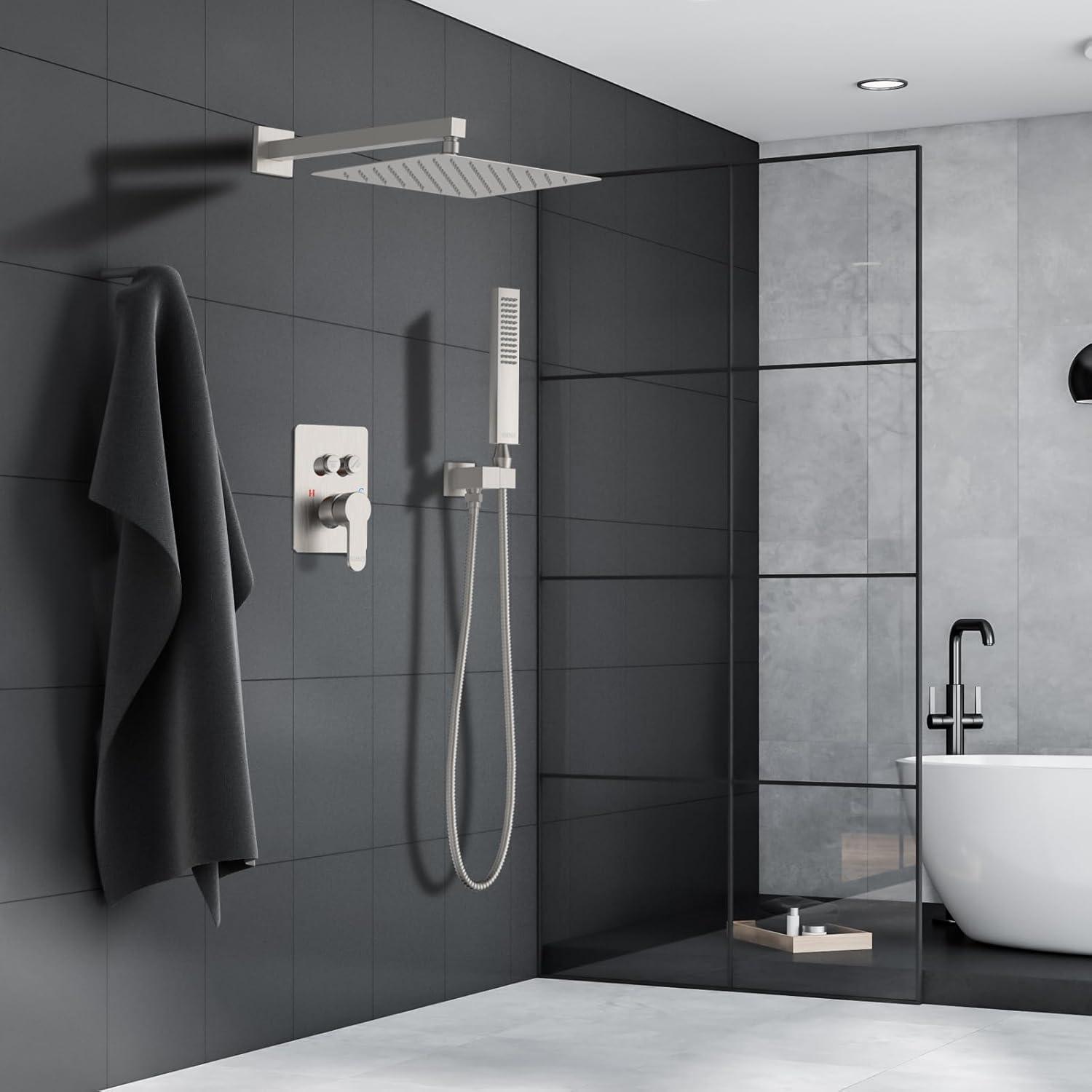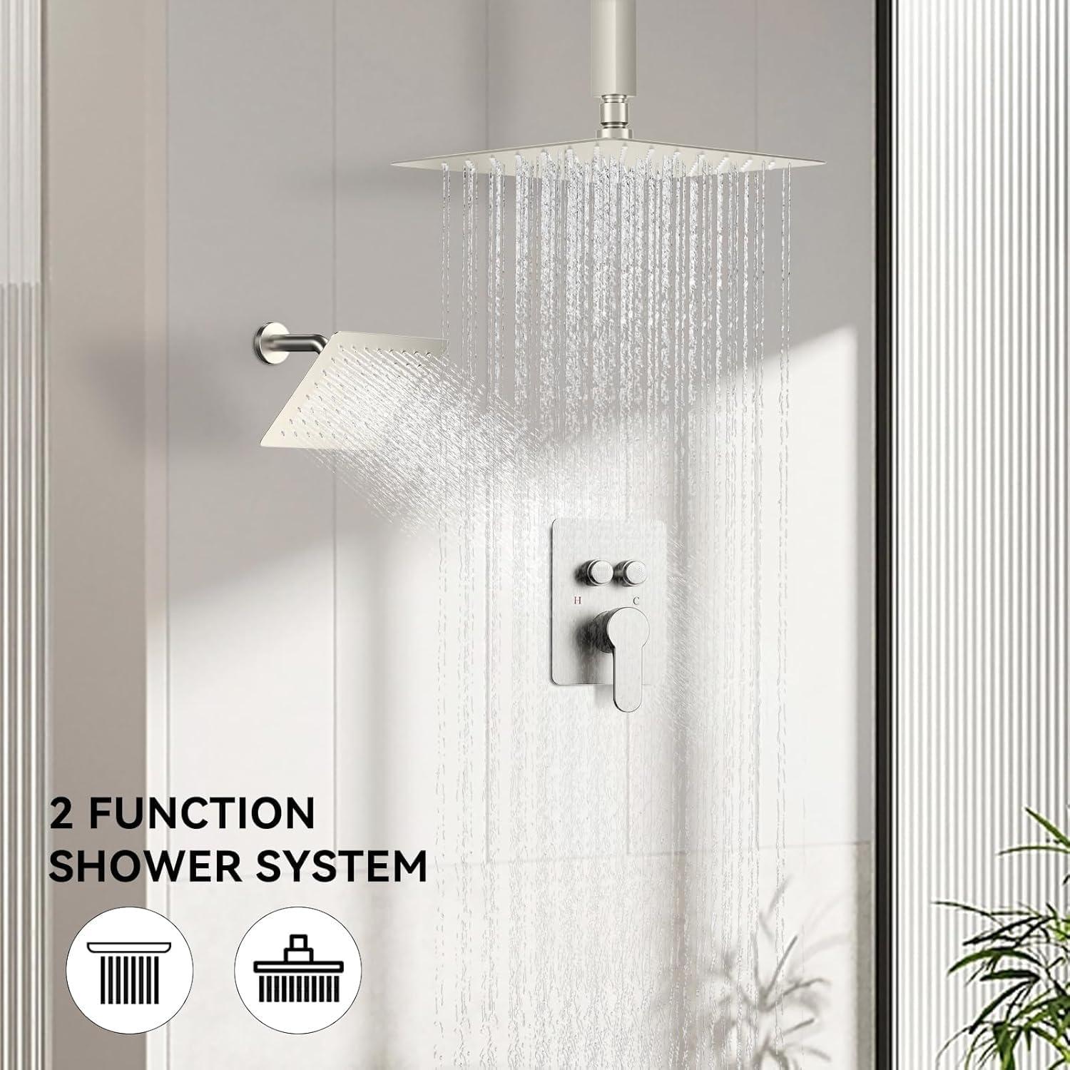 Rainfall Shower System, 10 inch Wall Mounted Rain Shower Head with Handle Set, Push Button Diverter 2 Functions Simultaneous Use,High Pressure Shower Faucet Set with Rough-in Valve, Brushed Nickel(Brushed Nickel)