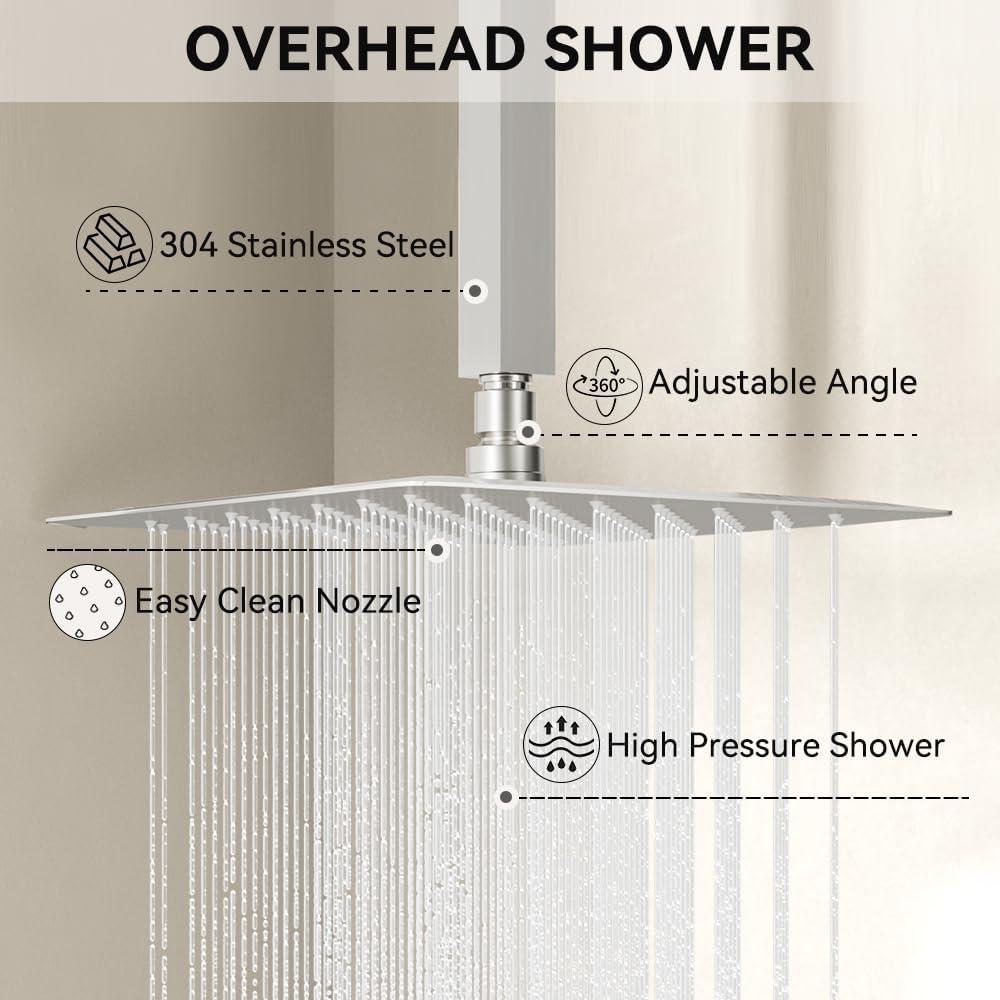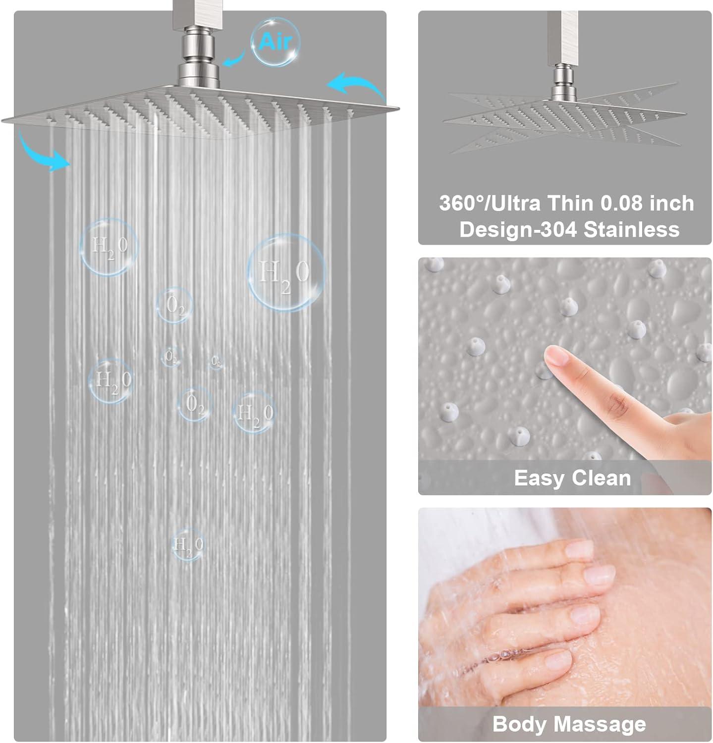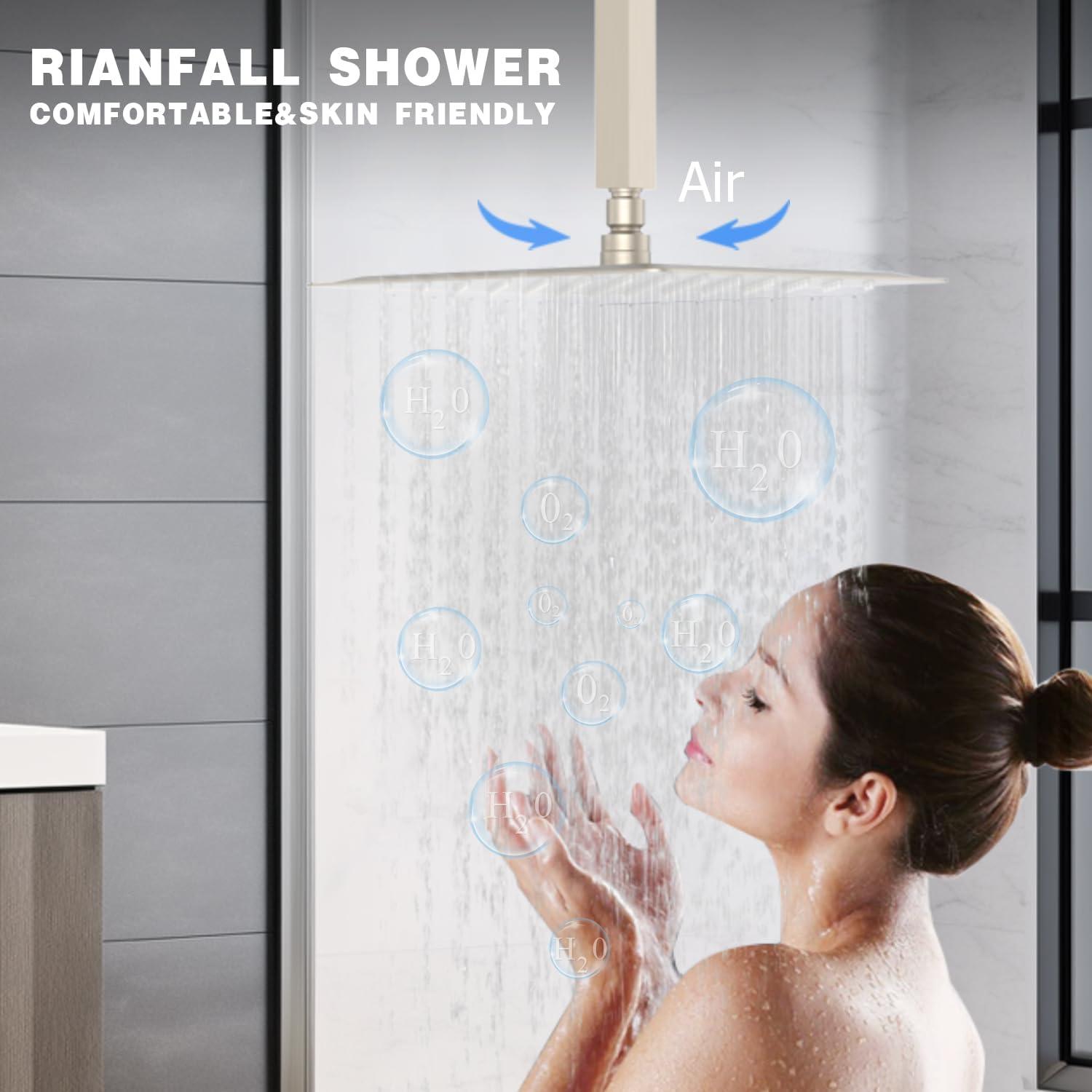 High Pressure Rainfall Shower: Equipped with advanced air jet technology, it can significantly enhance the water pressure and perfectly simulate the effect of natural rainfall, allowing you to feel as if you were in the embrace of nature and enjoy the pleasurable shower experience of intimate contact with water. Extra-large overhead shower head, covering a wide area, can easily rinse the whole body foam when showering, bringing a smooth and drenching bathing experience.