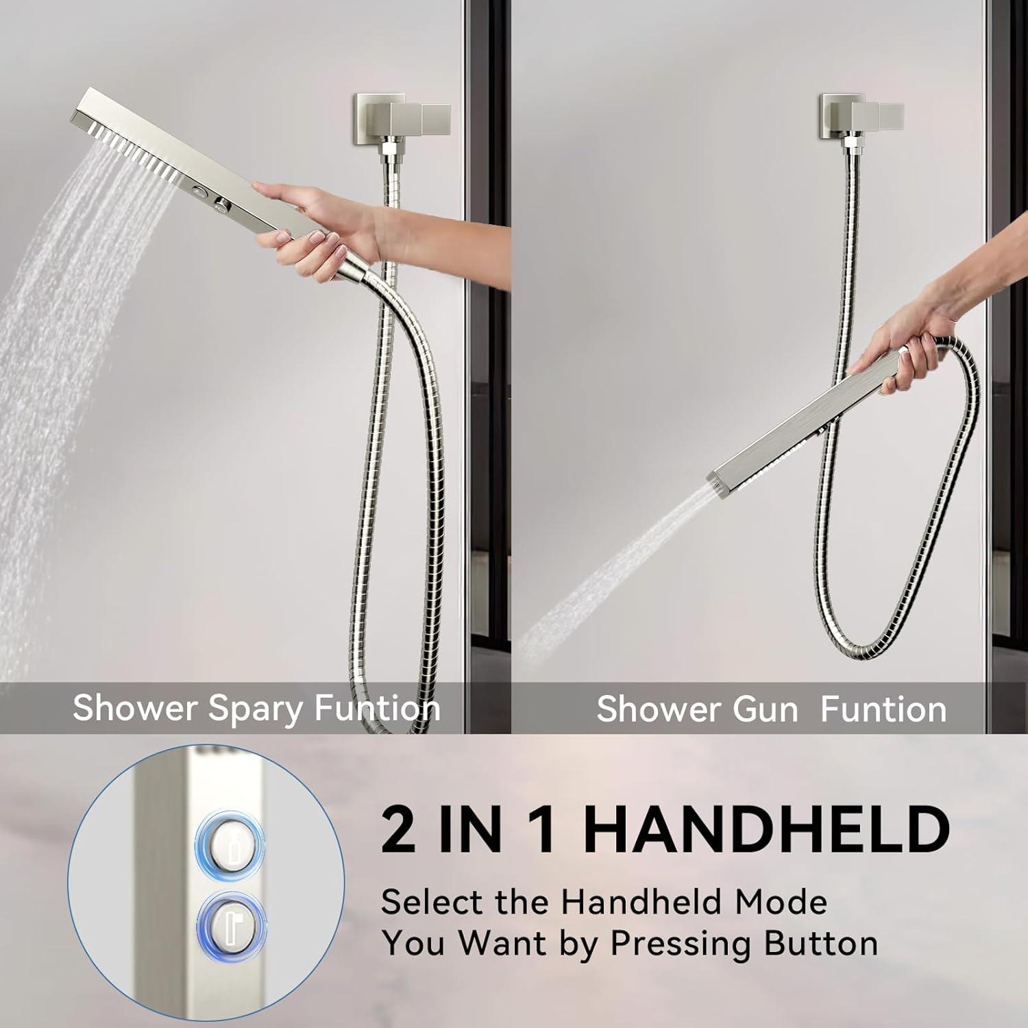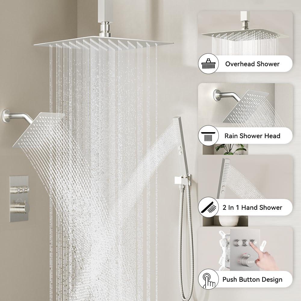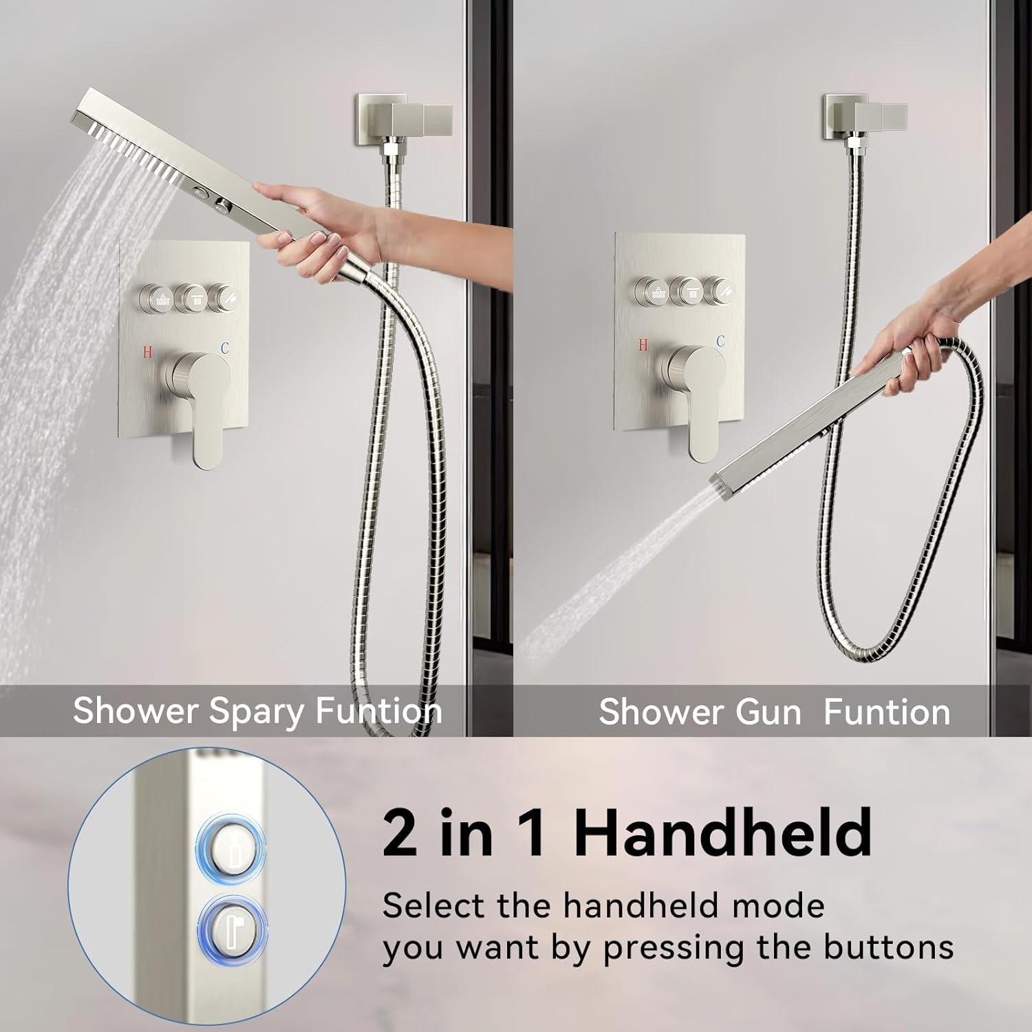Two-Function Shower Faucet Set: With the push-button switch, you can choose between a rainfall shower head or a handheld spray, and both functions can be used at the same time, bringing you a diversified showering experience.