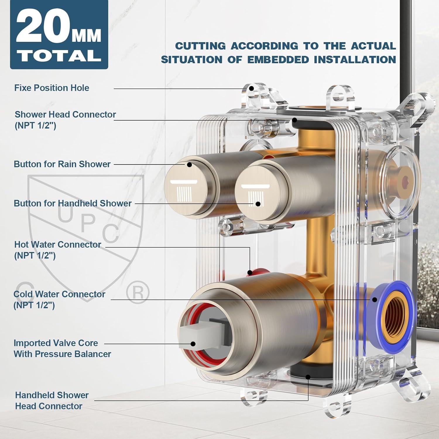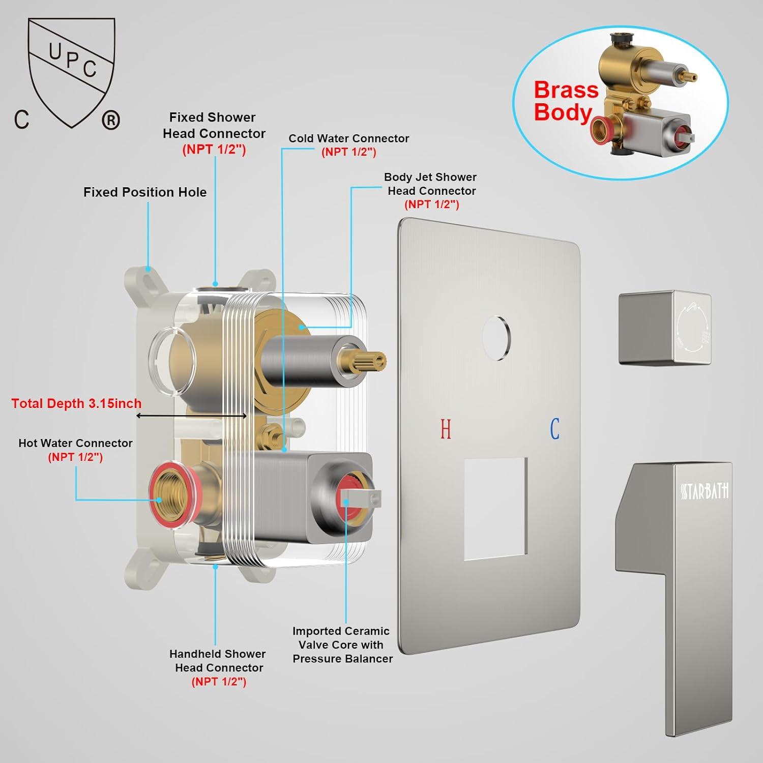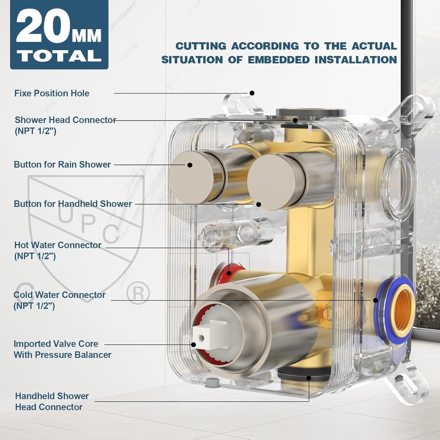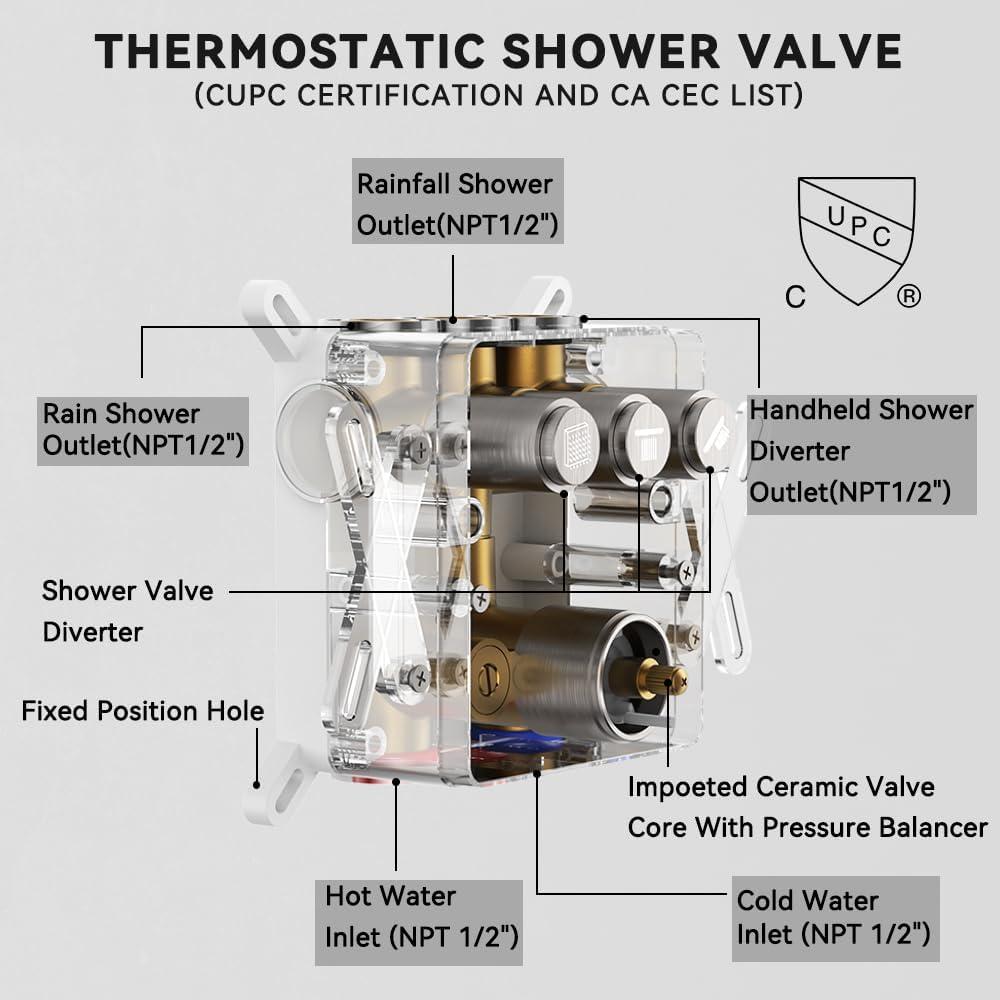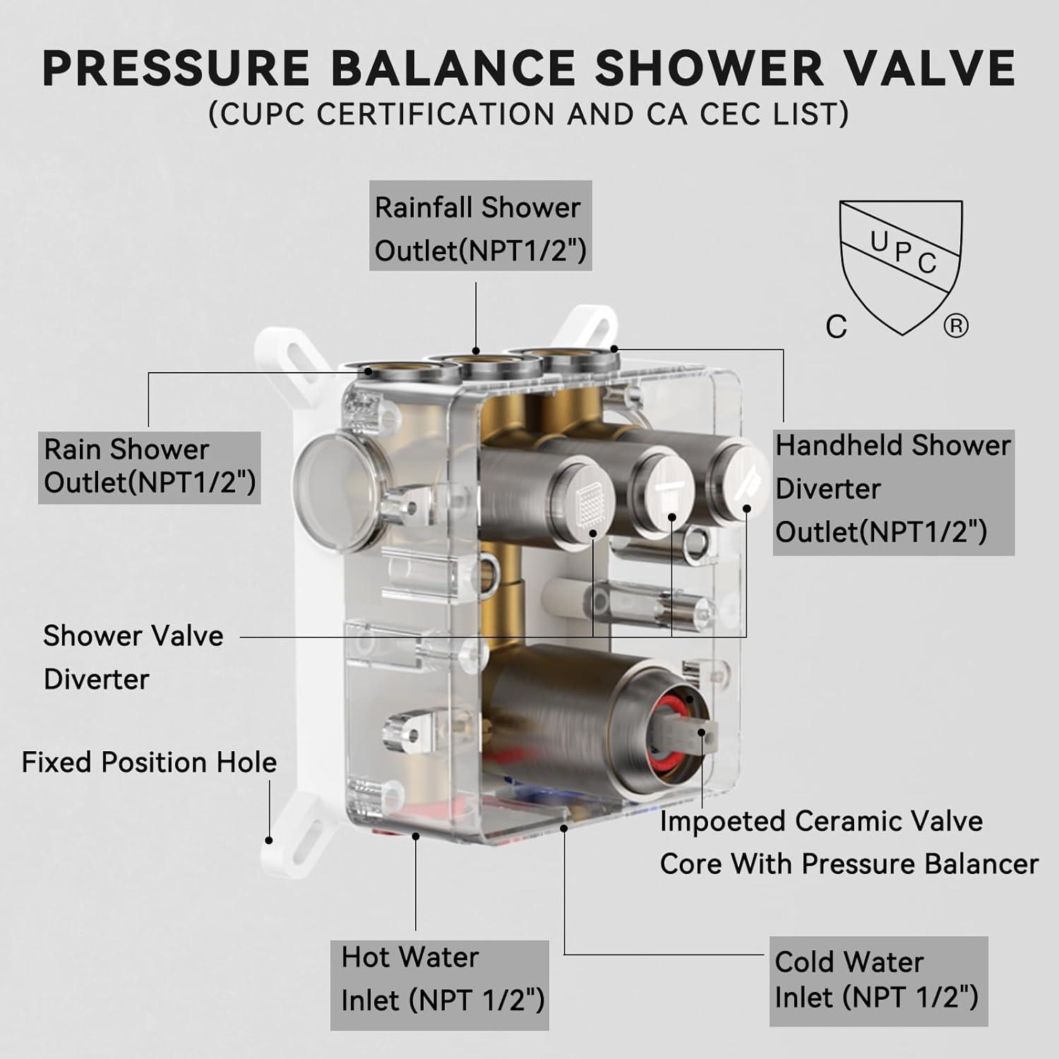 Anti-scald Pressure Balance Valve: Our rain shower system is designed with your family's safety in mind. It utilizes a cUPC certified pressure balance valve. This valve not only ensures superior quality and long-lasting durability, but also prevents scalding caused by unexpected changes in the temperature of the hot and cold water.