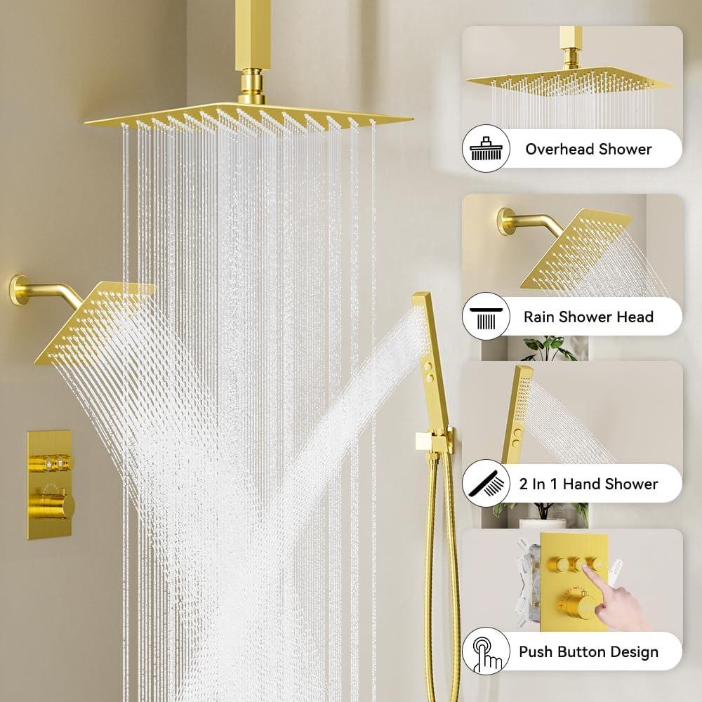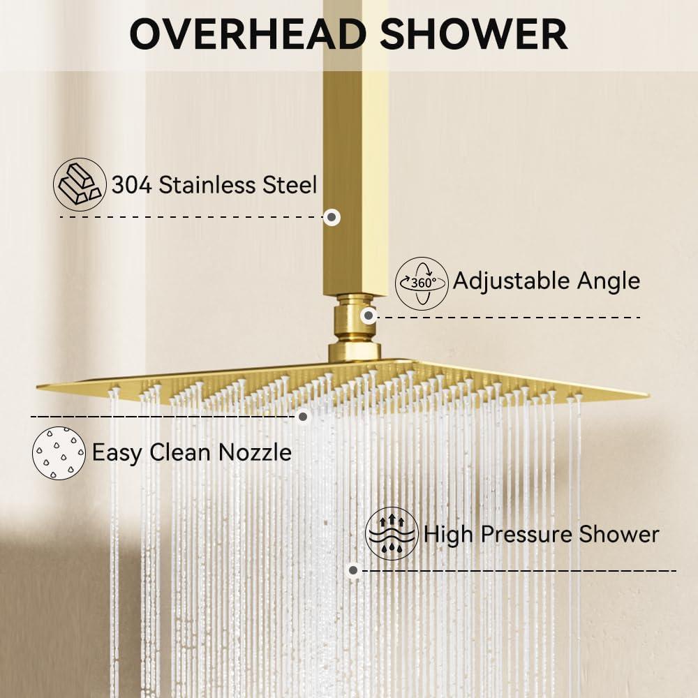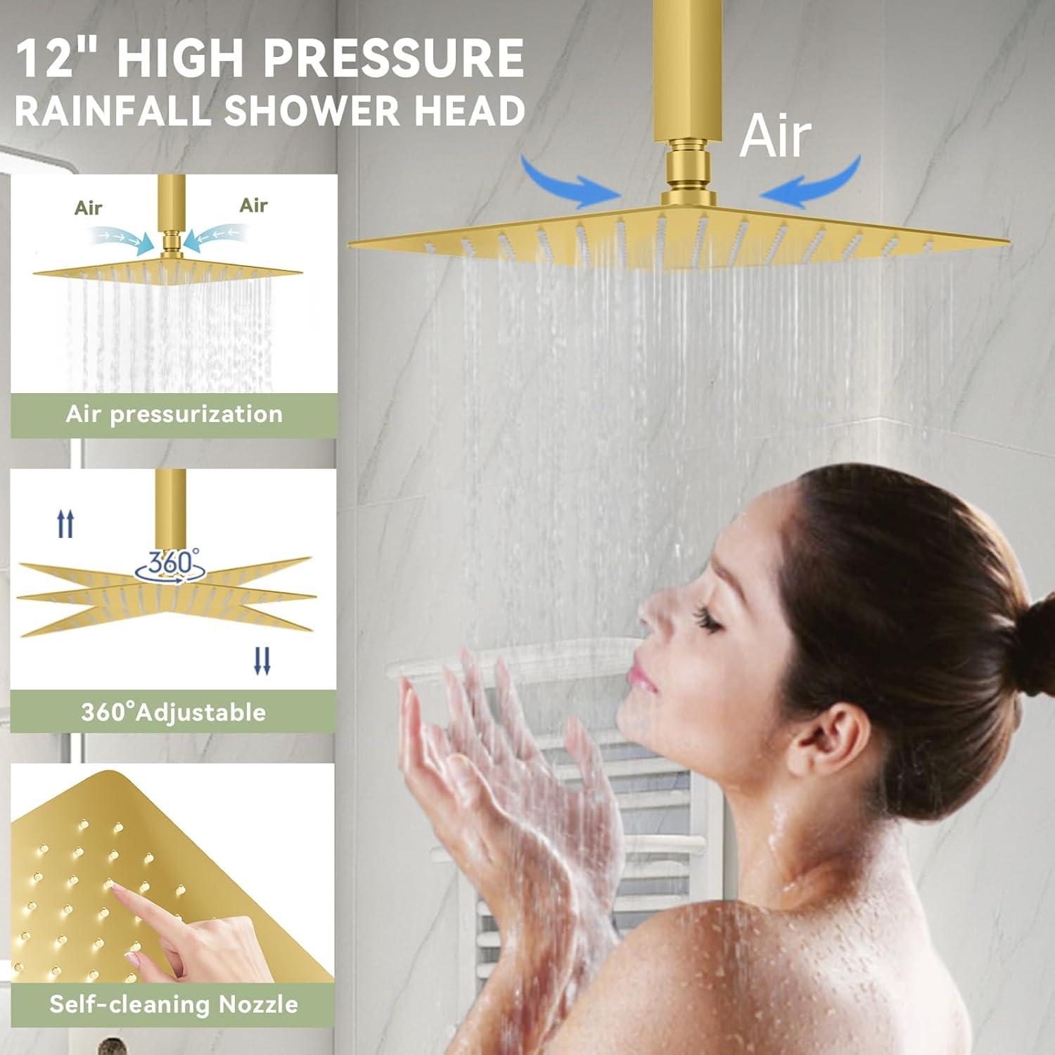 High Pressure Rainfall Shower: Equipped with advanced air jet technology, it can significantly enhance the water pressure and perfectly simulate the effect of natural rainfall, allowing you to feel as if you were in the embrace of nature and enjoy the pleasurable shower experience of intimate contact with water. Extra-large overhead shower head, covering a wide area, can easily rinse the whole body foam when showering, bringing a smooth and drenching bathing experience.