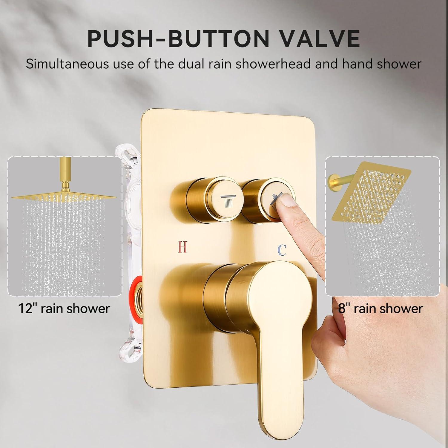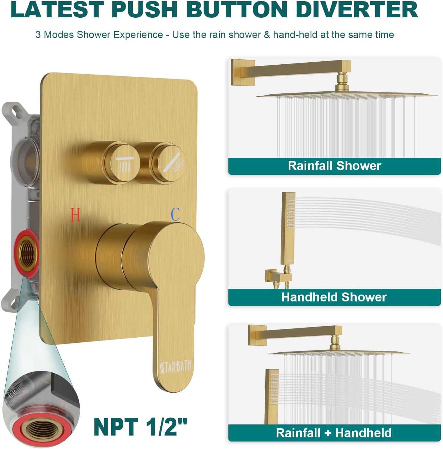 Two-Function Shower Faucet Set: With the push-button switch, you can choose between a rainfall shower head or a handheld spray, and both functions can be used at the same time, bringing you a diversified showering experience.