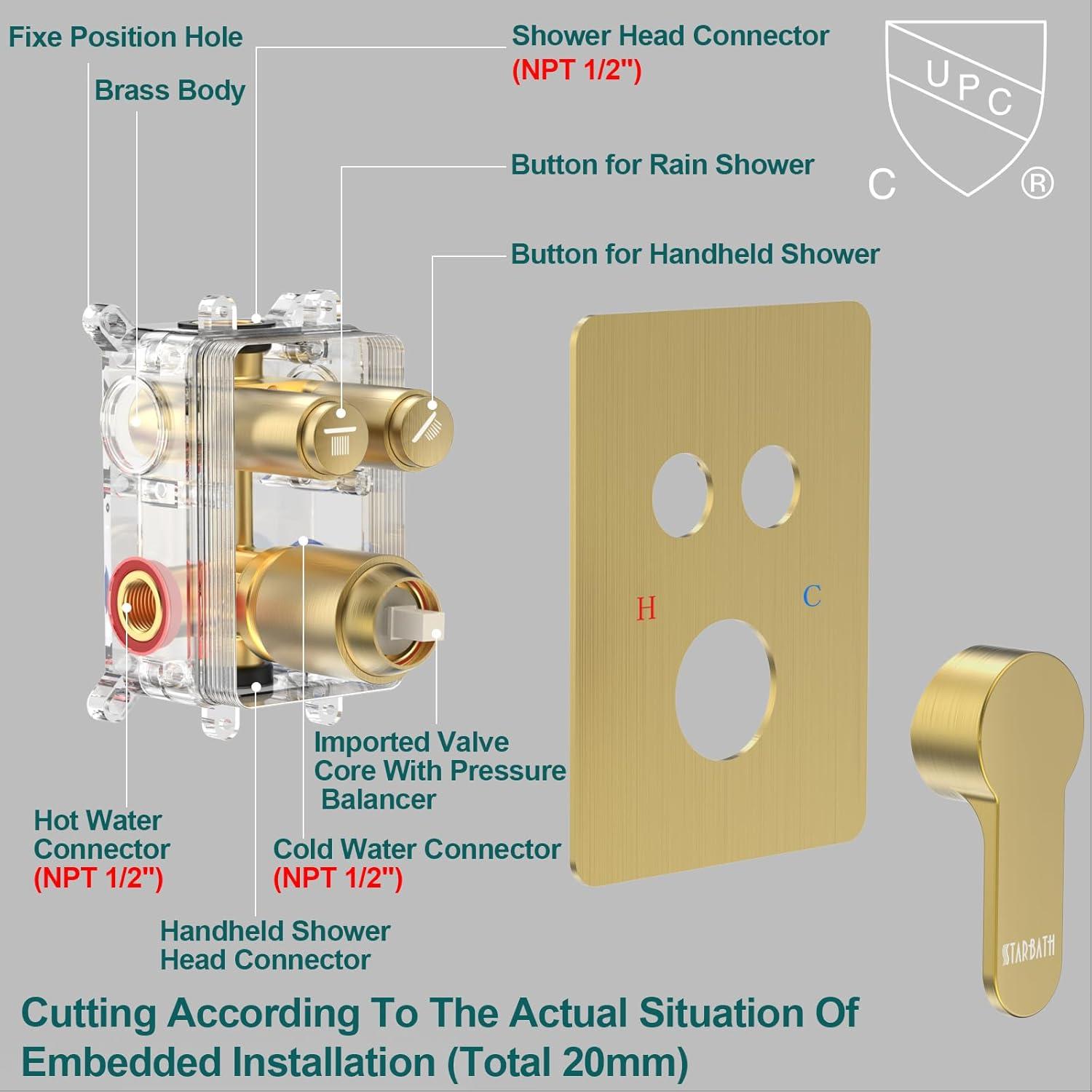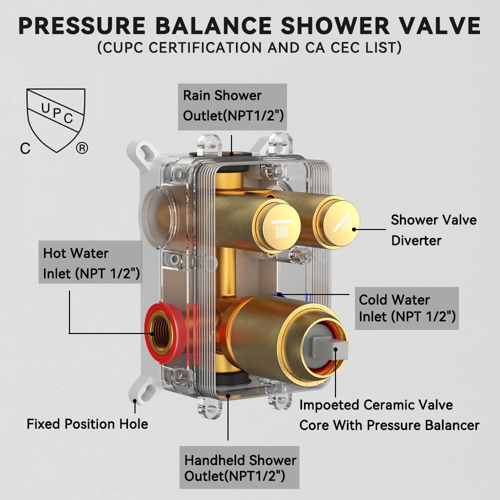 Anti-scald Pressure Balance Valve: Our rain shower system is designed with your family's safety in mind. It utilizes a cUPC certified pressure balance valve. This valve not only ensures superior quality and long-lasting durability, but also prevents scalding caused by unexpected changes in the temperature of the hot and cold water.