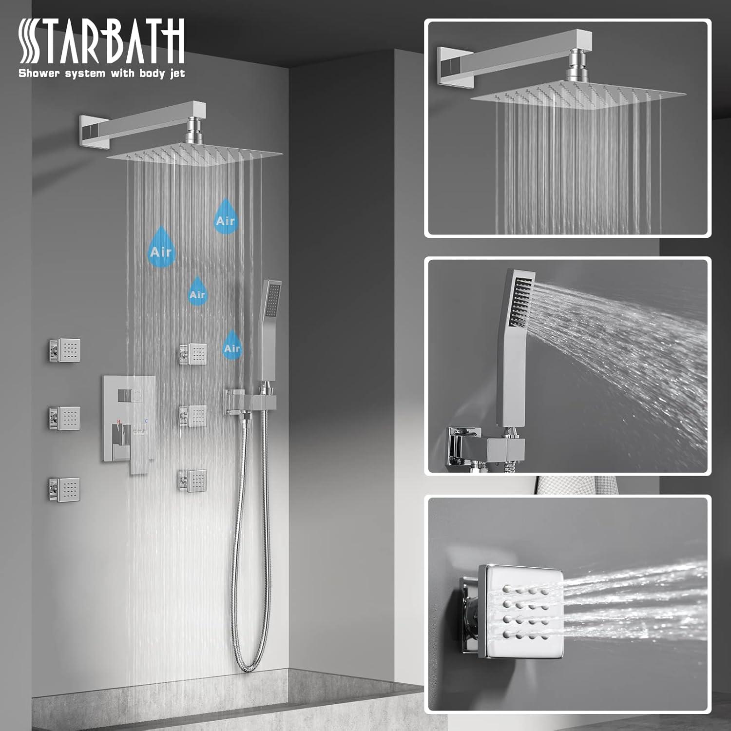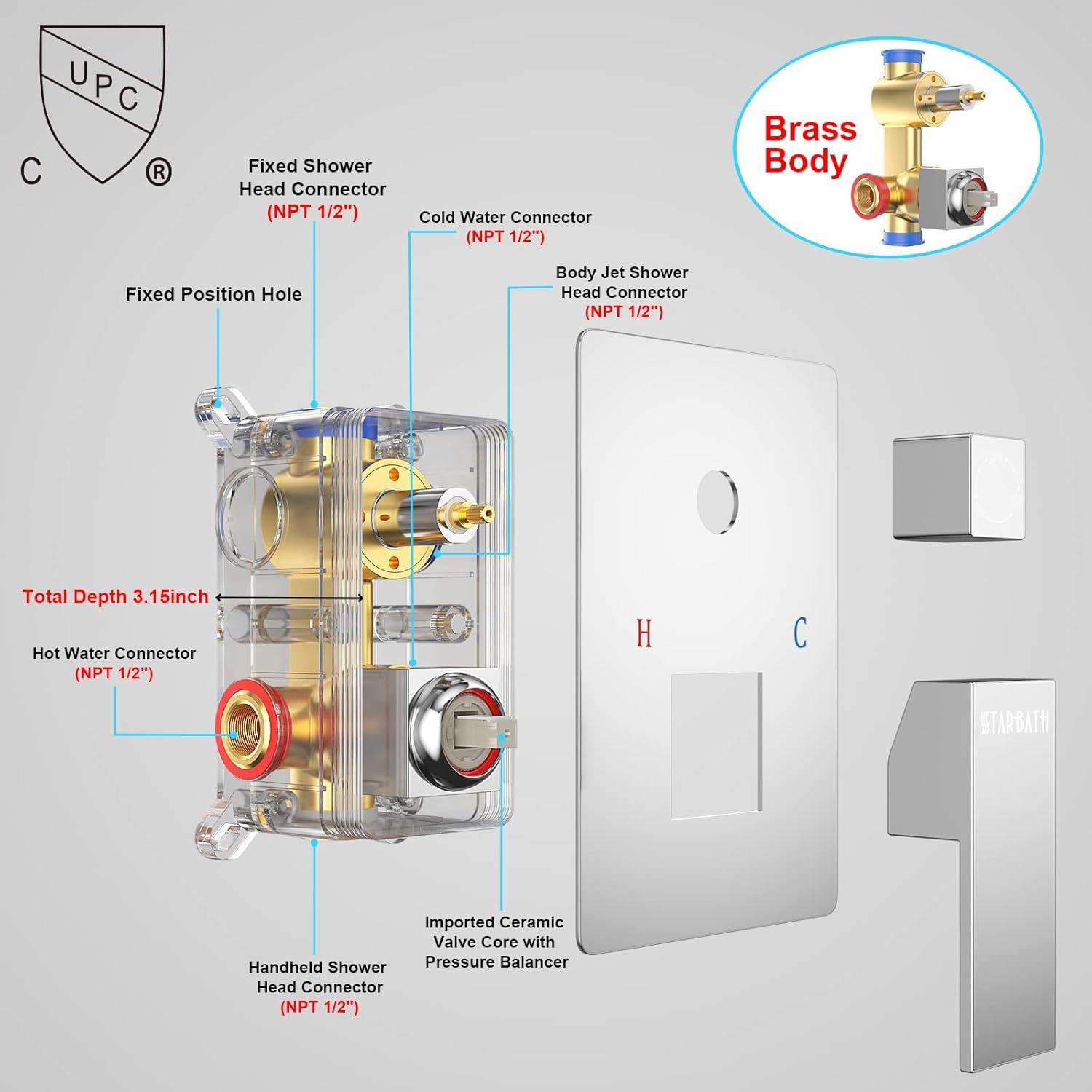 【ANTI-SCALD ROUGH IN MIXER VALVE】: Starbath shower system includes advanced pressure balance ceramic disc cartridge with cUPC certification, which can effectively protect you from scalding injury caused by sudden changes in hot or cold water pressure, maintaining consistent water temperature.