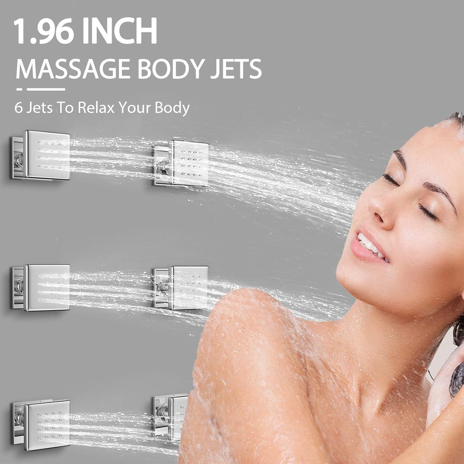 【THREE FUNCTIONS】3 functions shower jets system, even in low water pressure, shower spray jets can also provide a powerful shower, you can switch effortlessly from rain shower head to body jets or hand spray as you like(can NOT use together).