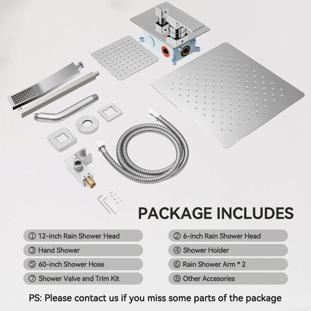 Complete Double Shower Head System: This all metal shower faucet set includes everything you need for a luxurious upgrade:12 inch large rain shower head and 6 inch ceiling shower head with shower arm, handheld spray, shower holder, 60-inch shower hose ,pressure balancing valve, Our product brass content is higher than others, corrosion-resistant and more durable