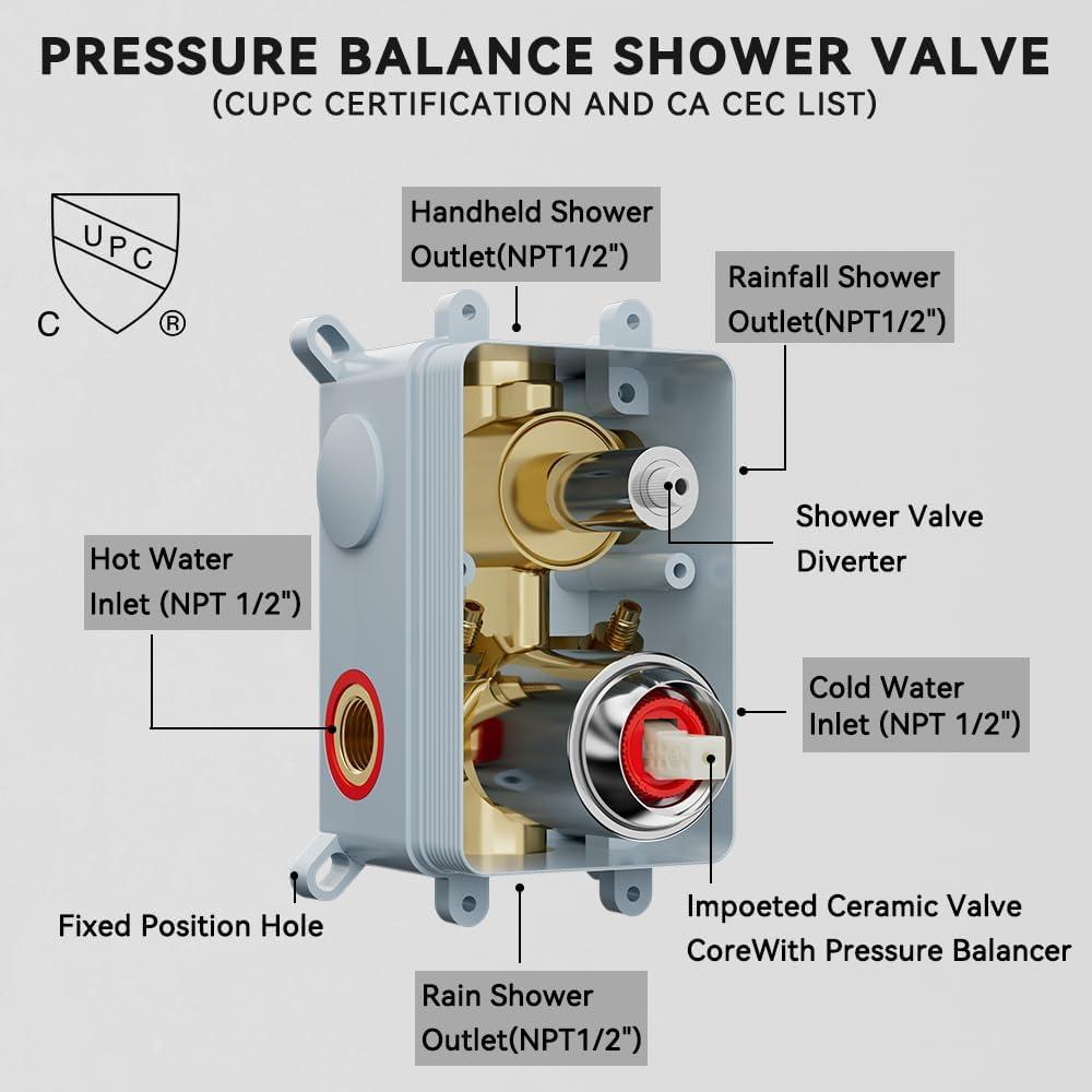 Easy adjustment and smooth operation: 3 functions shower valve control is clearly labeled for effortless identification.You can turn the knob to switch to rain shower and handheld spray. It smoothly adjusts water pressure and allows the volume or flow of water to be changed independently through the single handle lever. The built – in check valves of the shower valve constantly monitor water pressure balance, shielding you from scalds due to sudden hot or cold water pressure changes