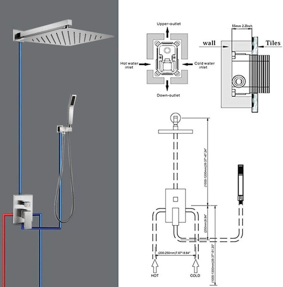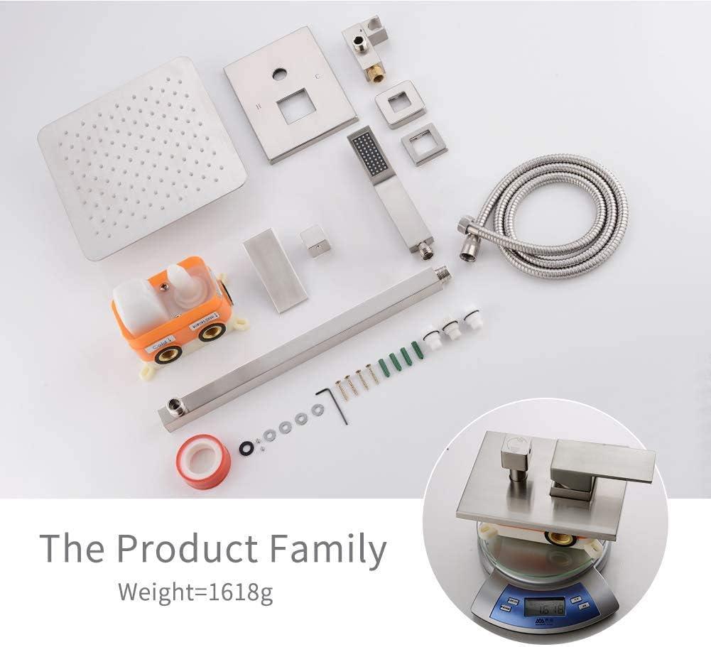 INCLUDES: 12 inch Square rain shower head (304 stainless steel), handheld shower head (Brass), 16 inches shower arm (Brass), 1.5M shower hose (304 stainless steel), shower holder (Brass), shower mixer control valve (Brass);
