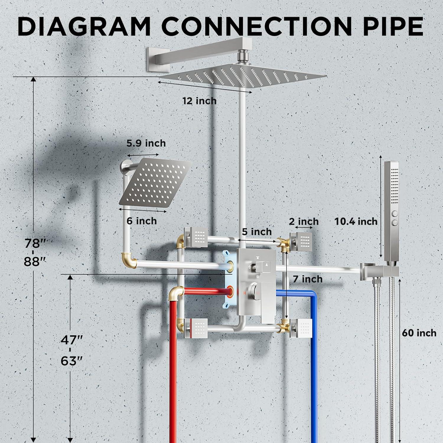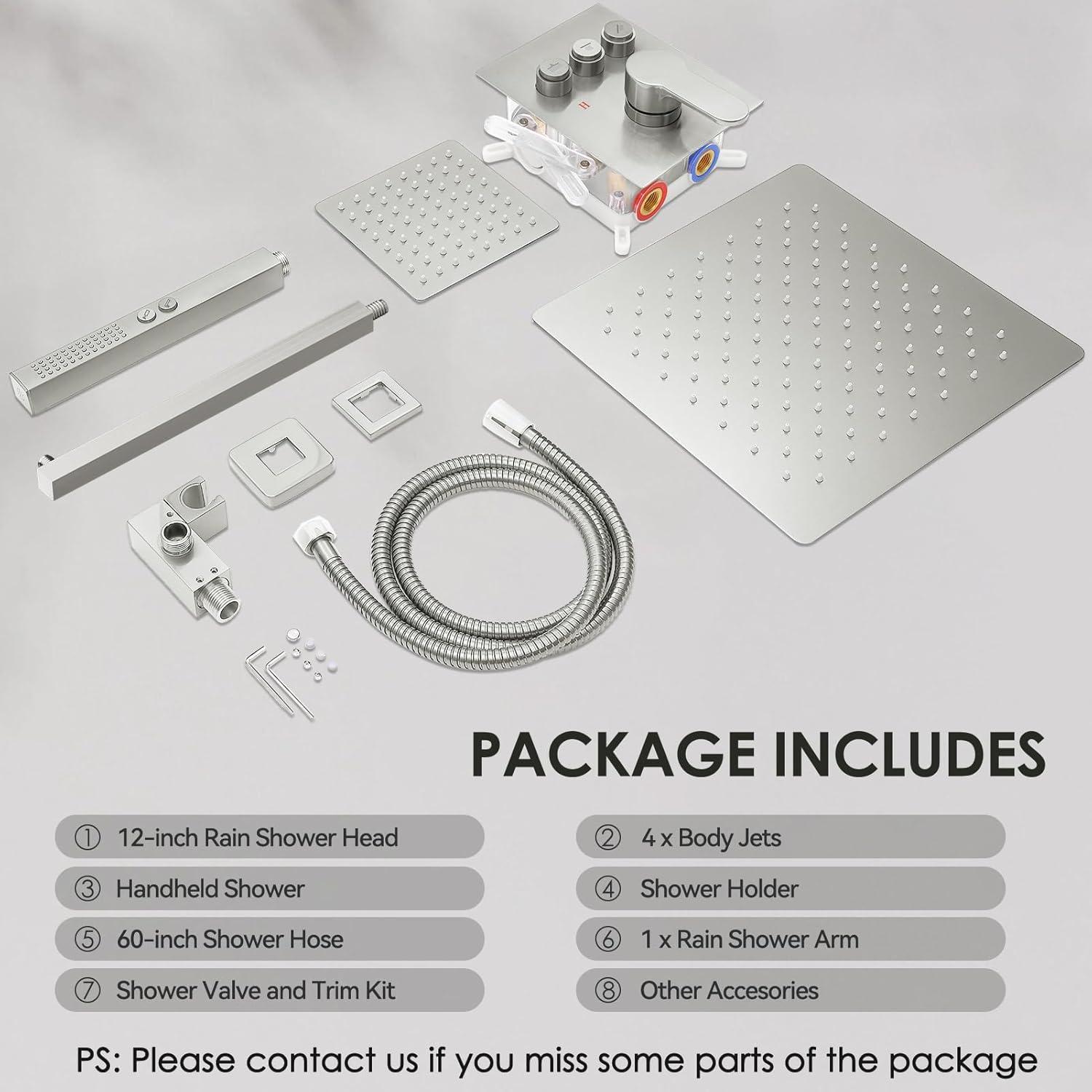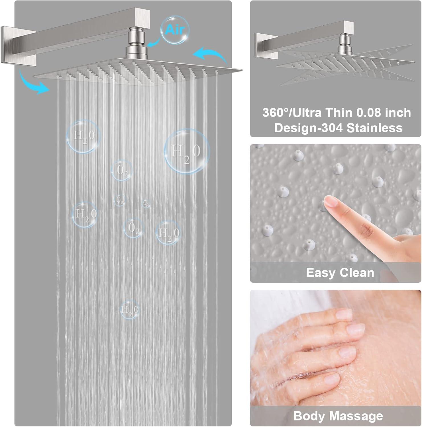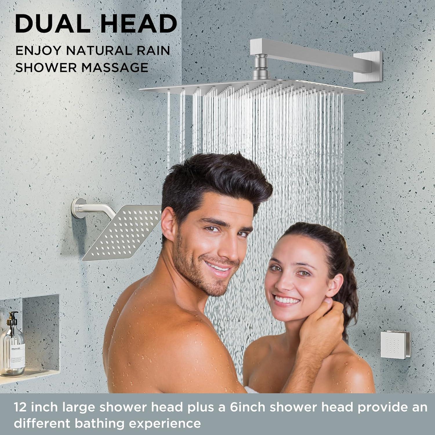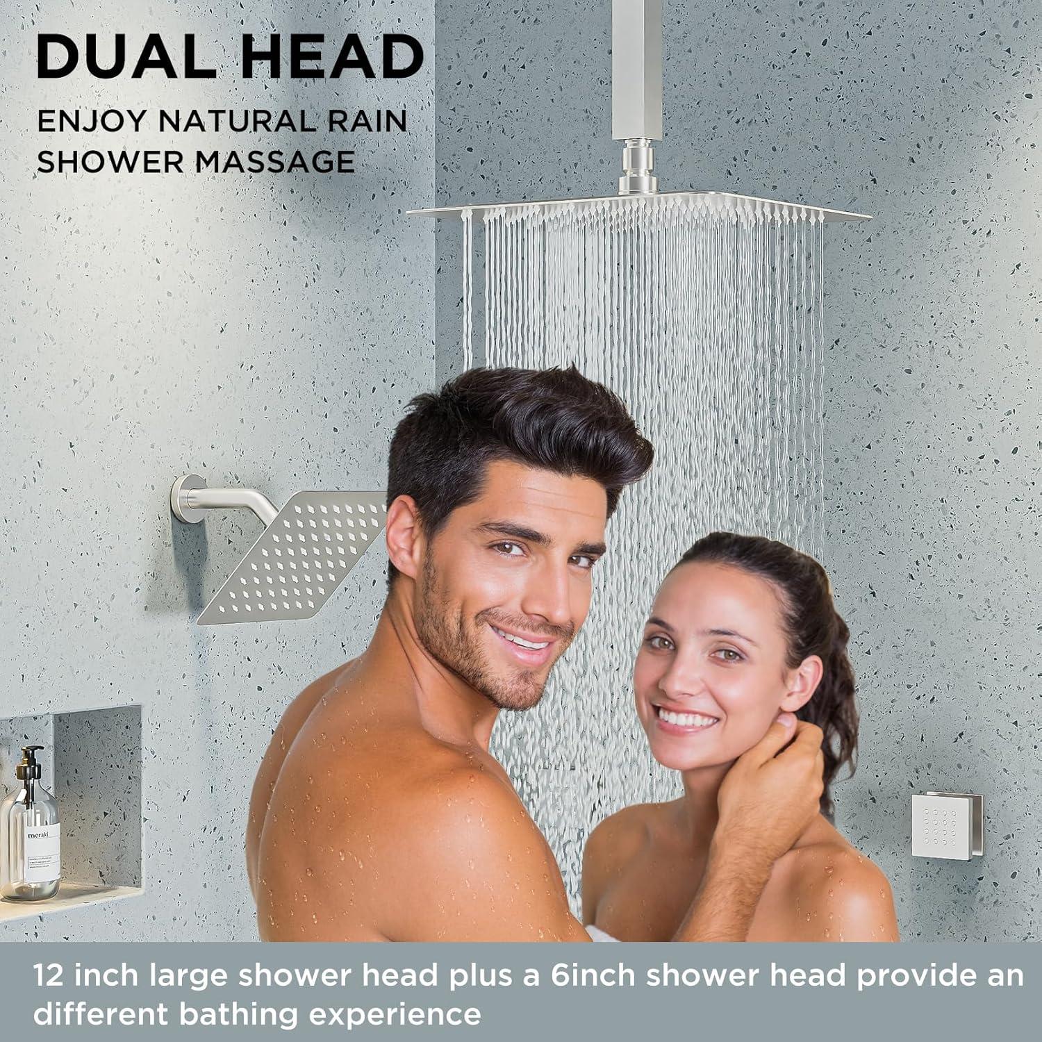 Complete Double Shower Head System: This all metal shower faucet set includes everything you need for a luxurious upgrade:12 inch large rain shower head and 6 inch ceiling shower head with shower arm, handheld spray, 4 body jets,shower holder, 60-inch shower hose ,pressure balancing valve, Our product brass content is higher than others, corrosion-resistant and more durable