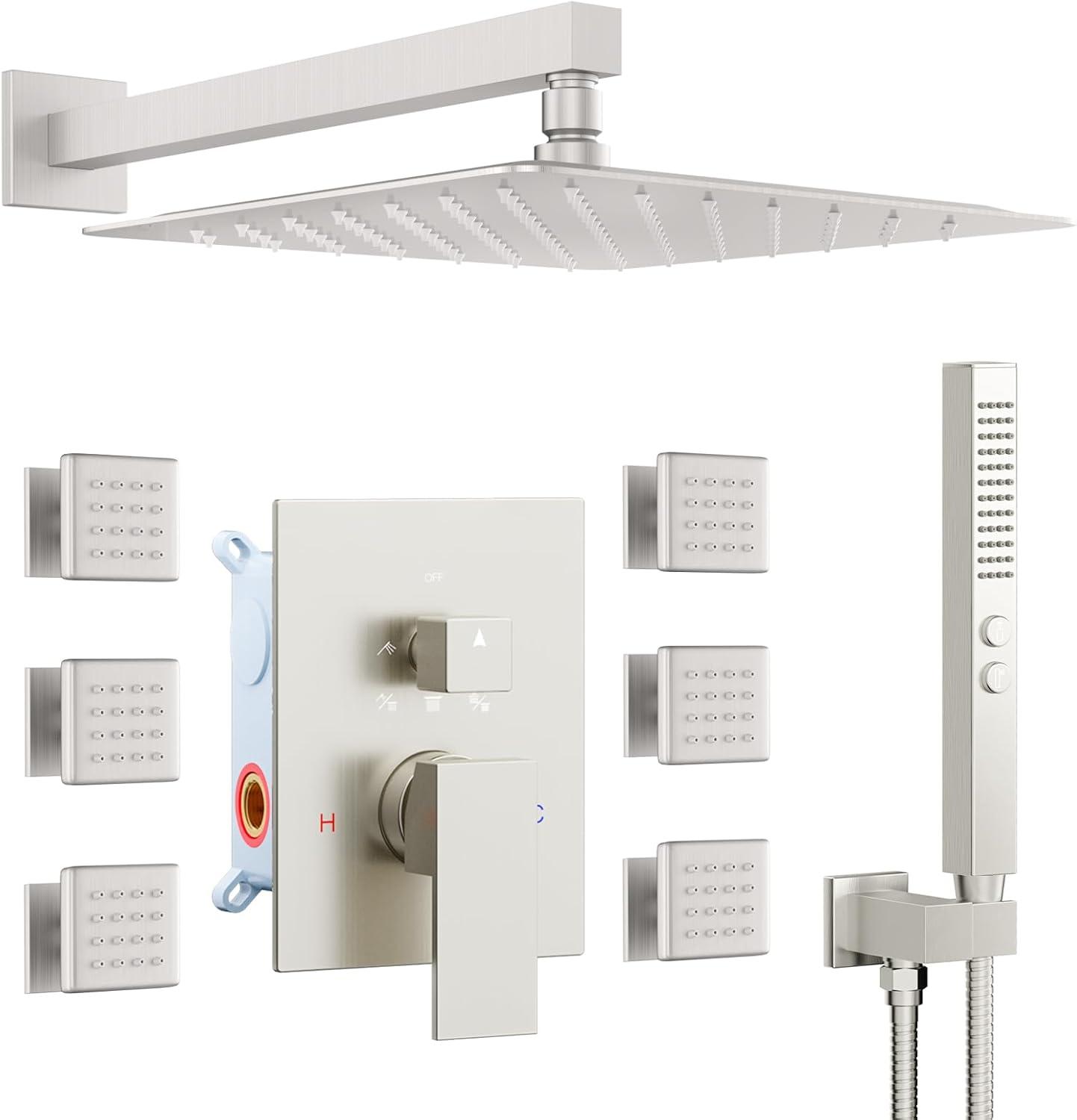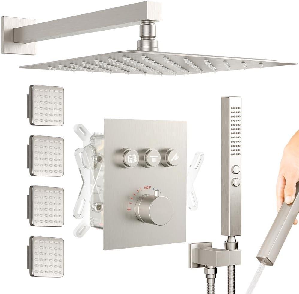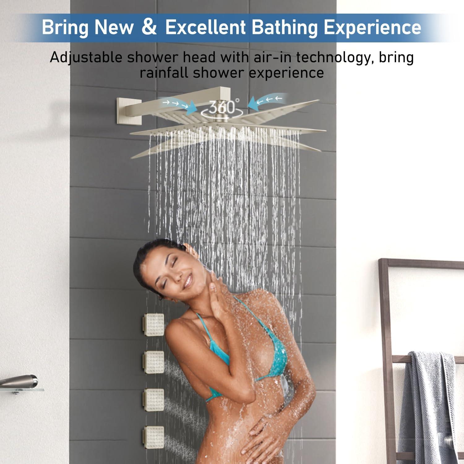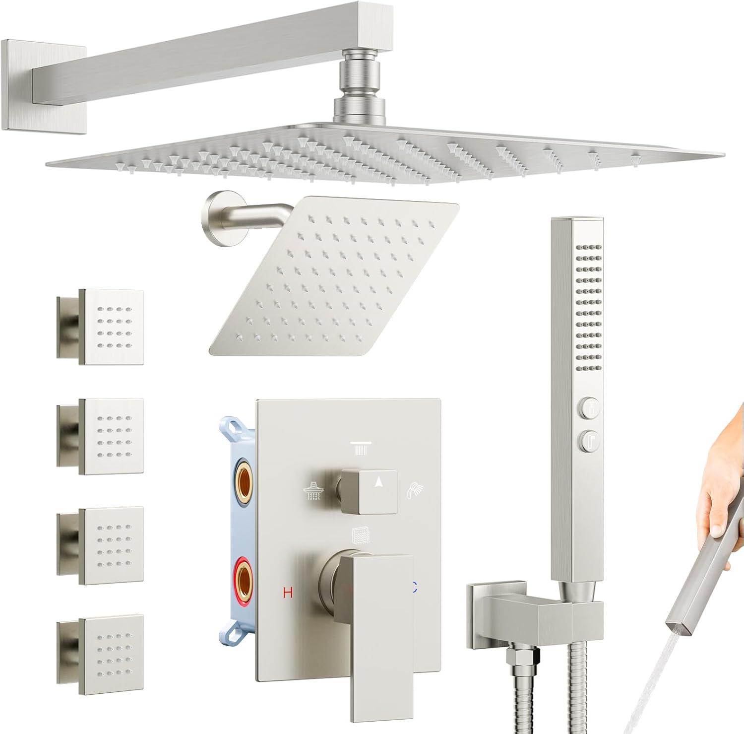 Complete Double Shower Head System: This all metal shower faucet set includes everything you need for a luxurious upgrade:12 inch large rain shower head and 6 inch ceiling shower head with shower arm, handheld spray, 4 body jets,shower holder, 60-inch shower hose ,pressure balancing valve, Our product brass content is higher than others, corrosion-resistant and more durable