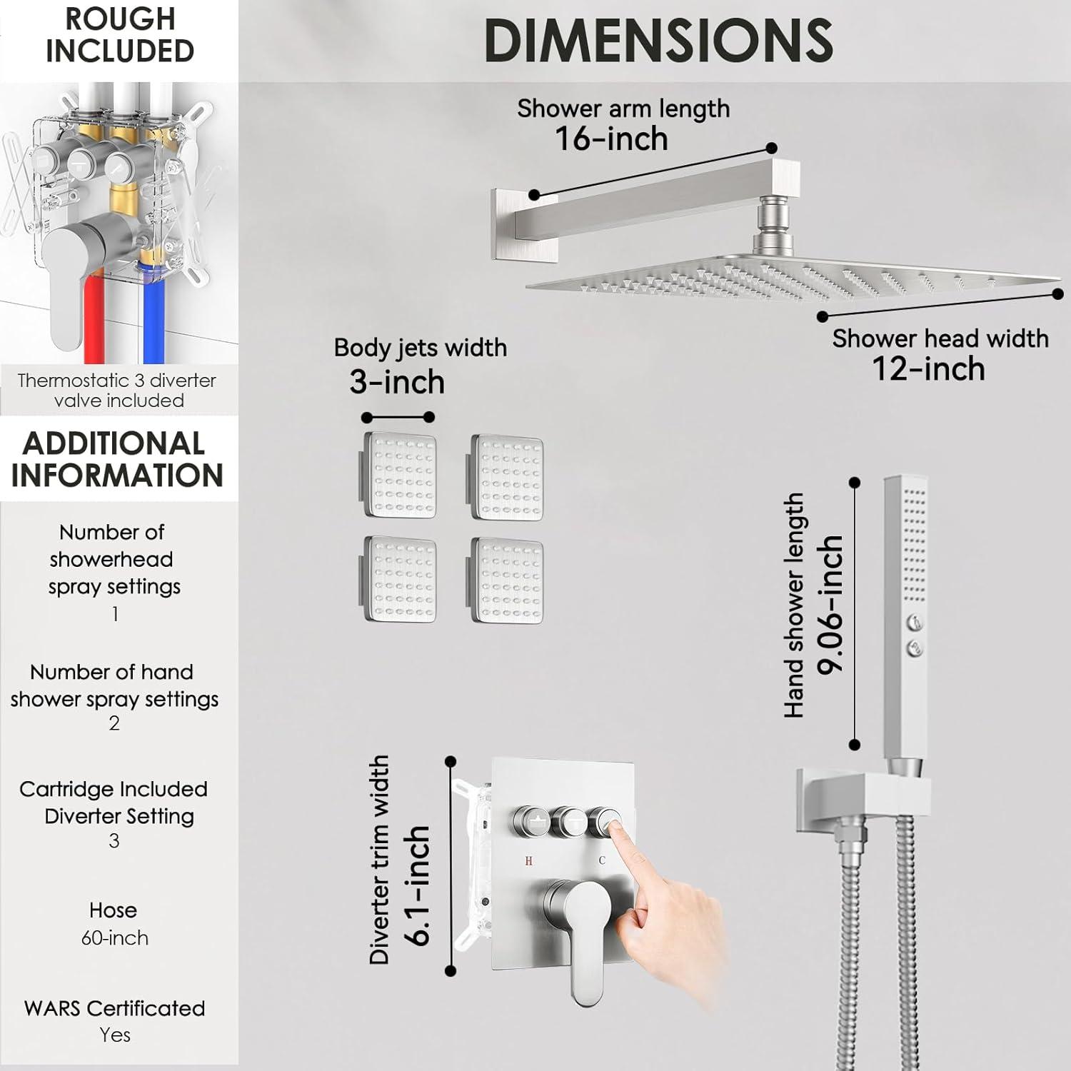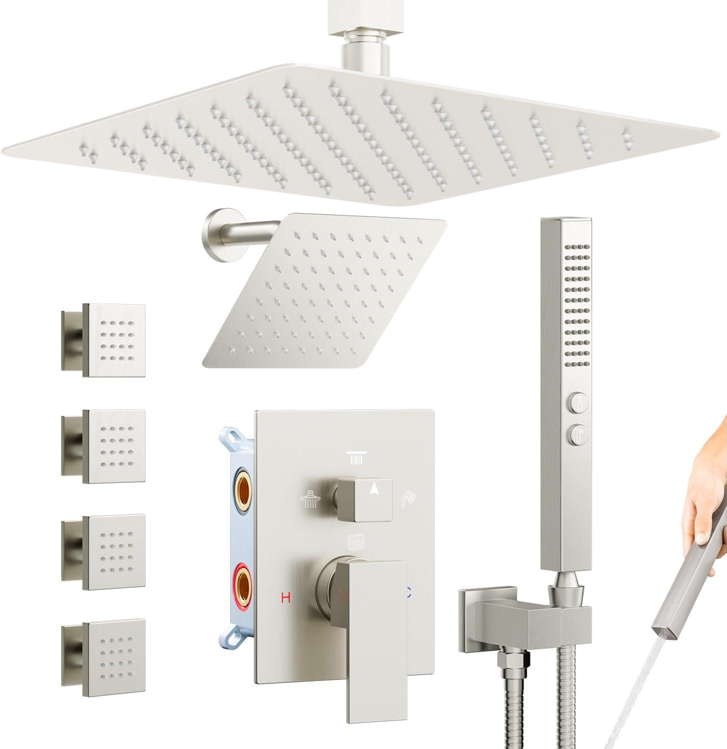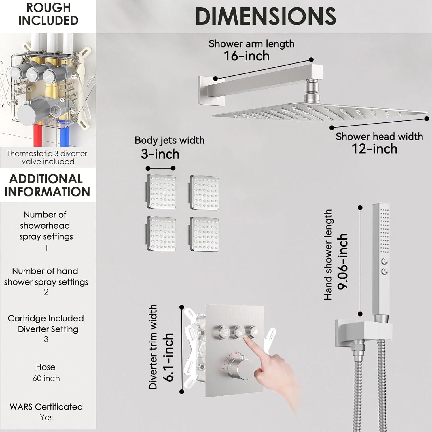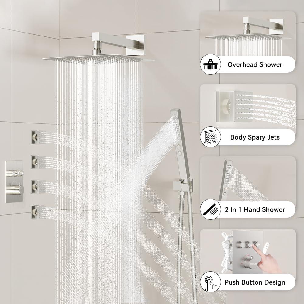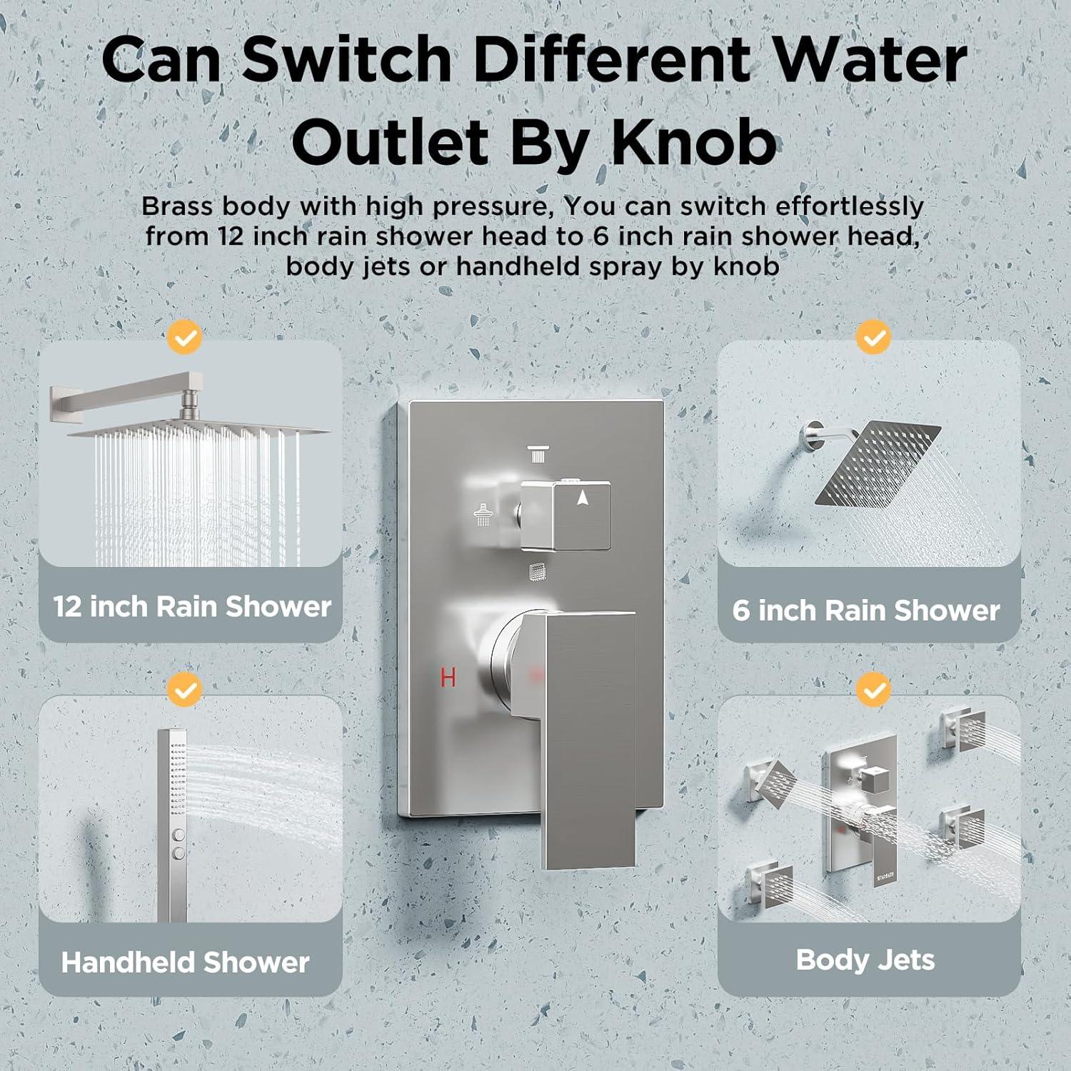 Complete Double Shower Head System: This all metal shower faucet set includes everything you need for a luxurious upgrade:12 inch large rain shower head and 6 inch ceiling shower head with shower arm, handheld spray, 4 body jets,shower holder, 60-inch shower hose ,pressure balancing valve, Our product brass content is higher than others, corrosion-resistant and more durable