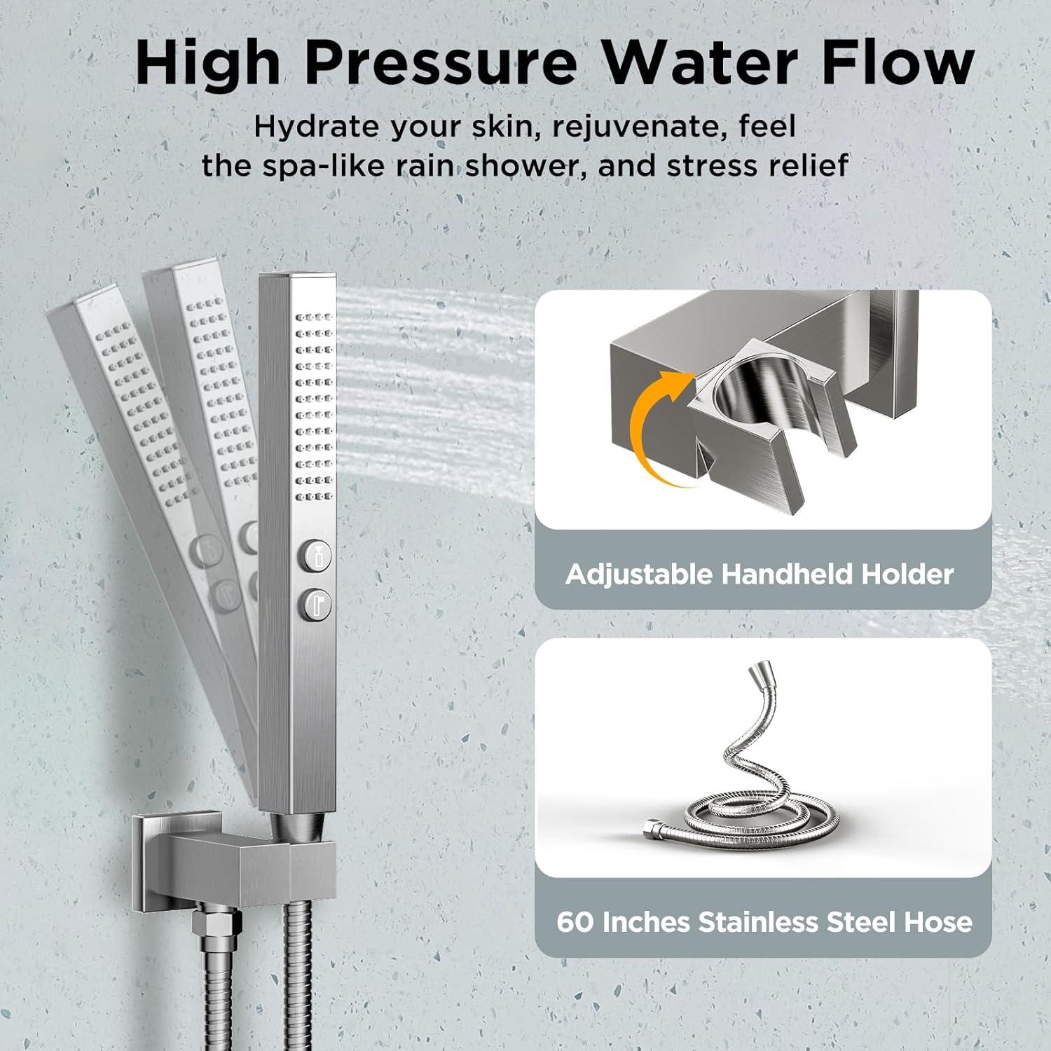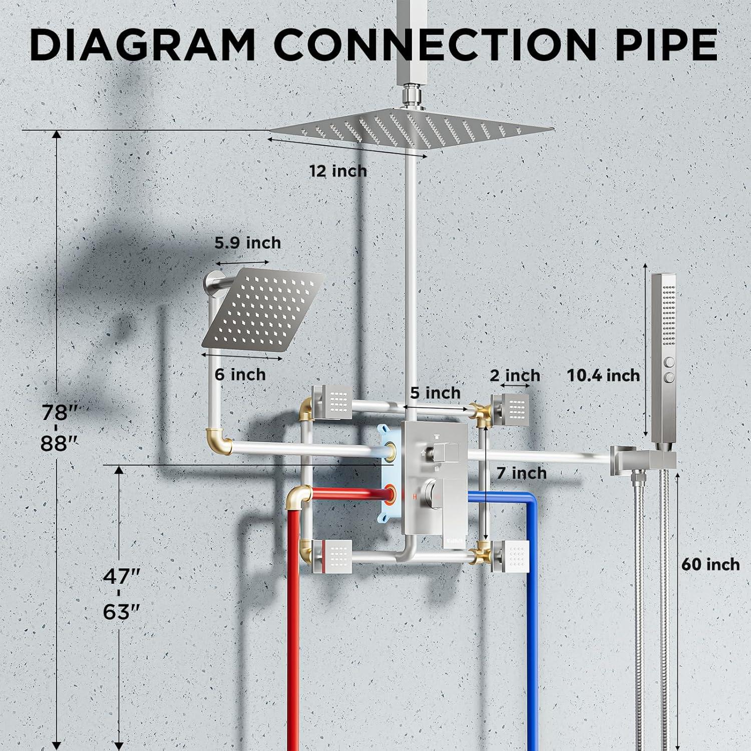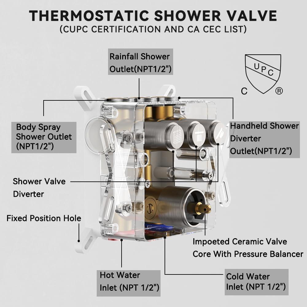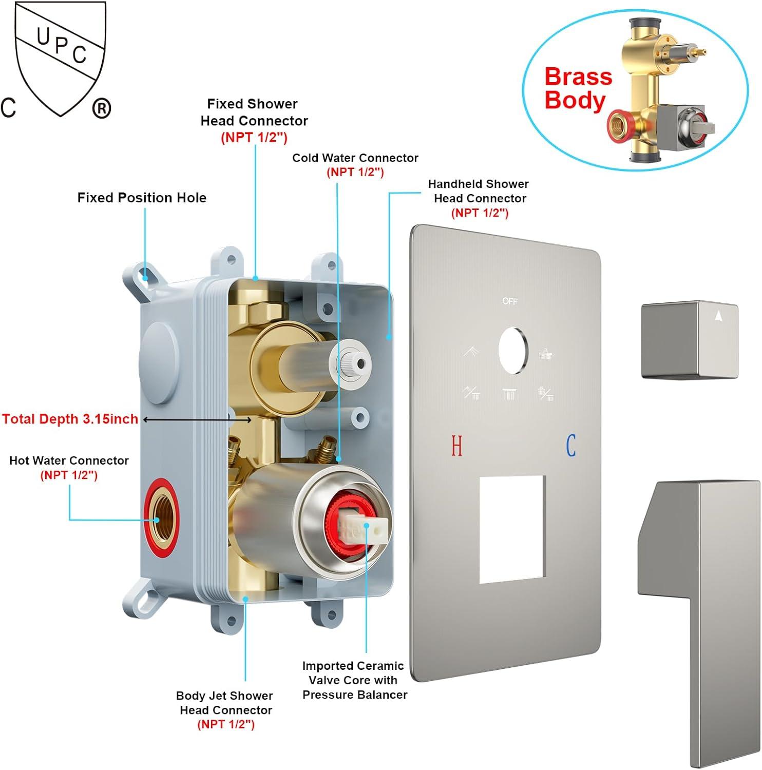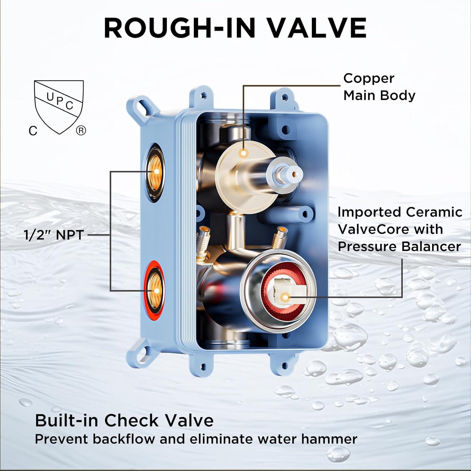 Certified Safety & Standard Connections:This Rain Shower Head and Handle Set it features a cUPC certified pressure balance valve with built-in check valves to monitor water pressure and prevent scalding, approved by the California Energy Commission for standard 1/2-inch US pipe connections