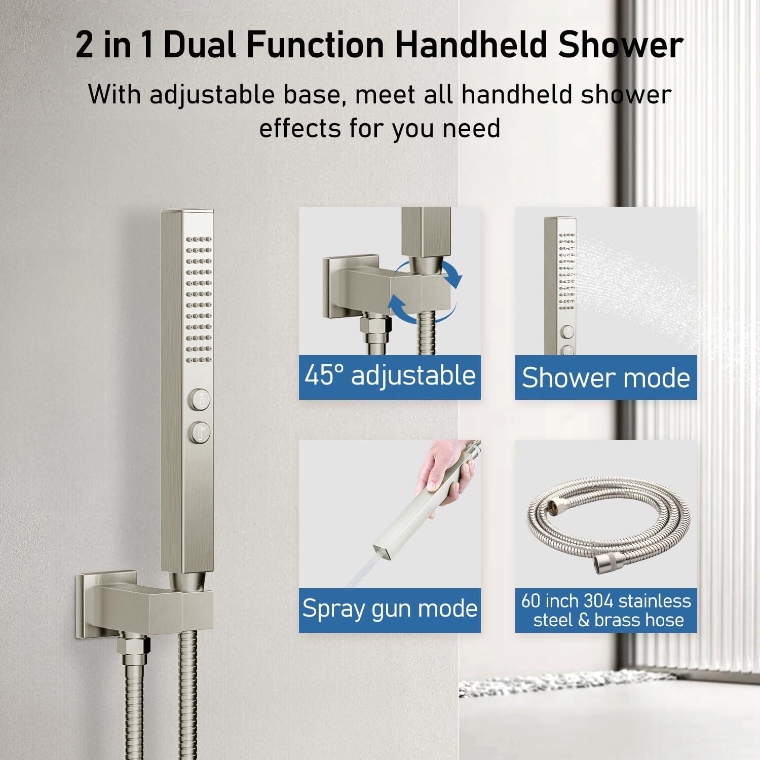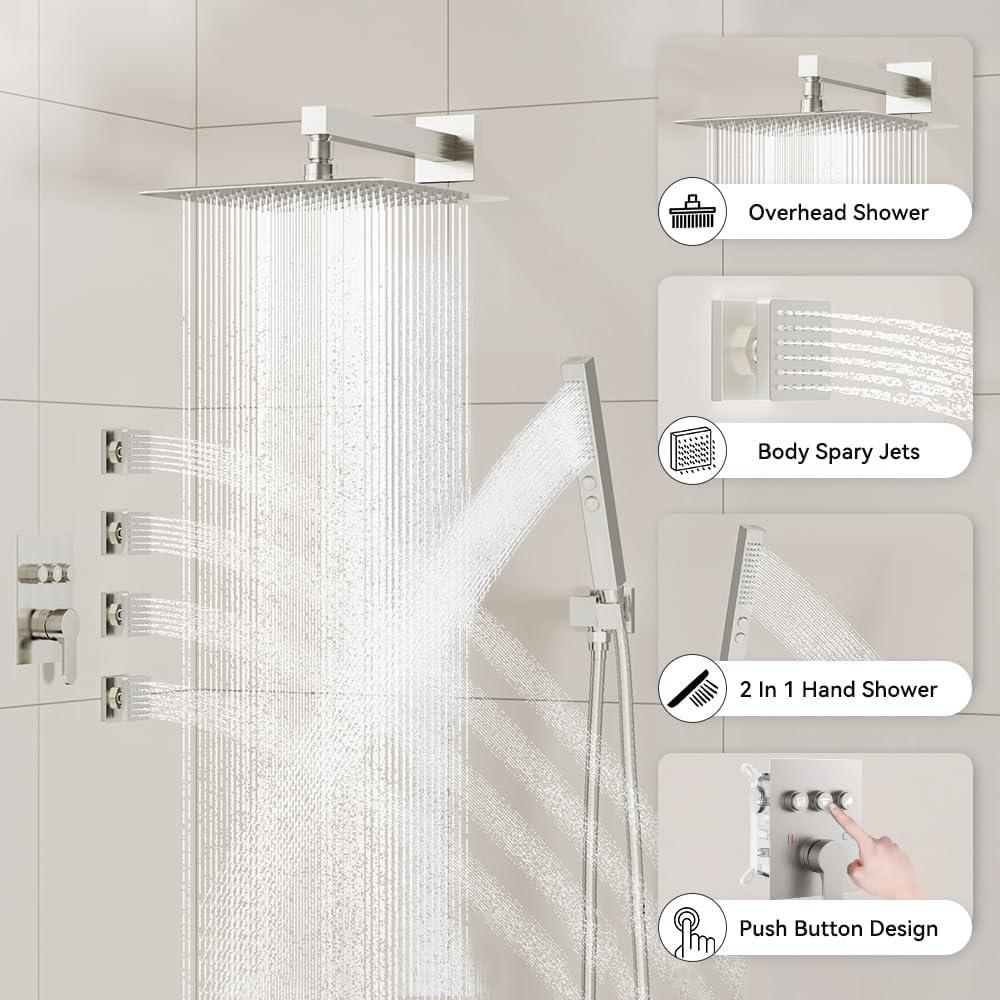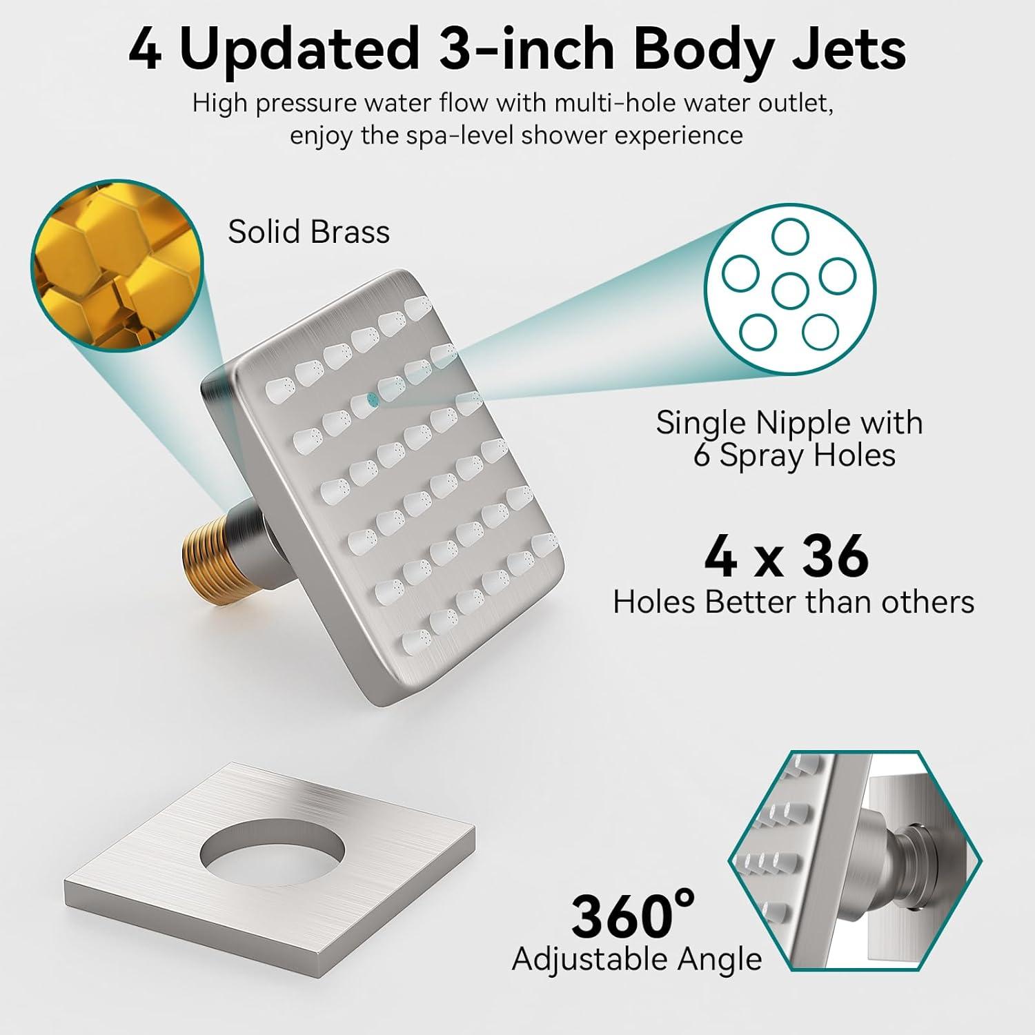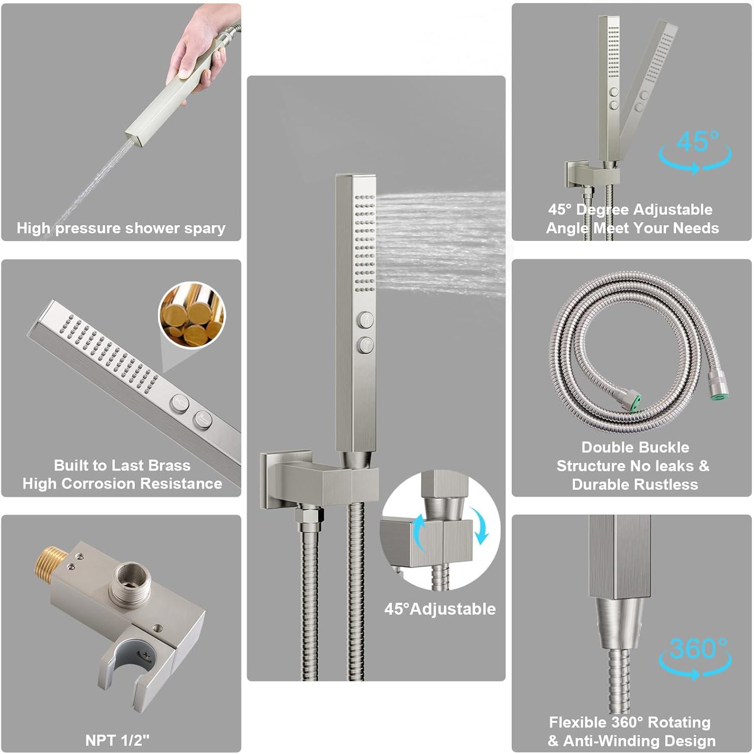 Resistant to tarnishing and corrosion components: the 4 way shower system is made of high-quality materials like brass and stainless steel.the durability and tarnish resistance finish is durable; The shower head and handheld easy to clean, the silicone nozzles allow mineral deposits to be wiped away easily