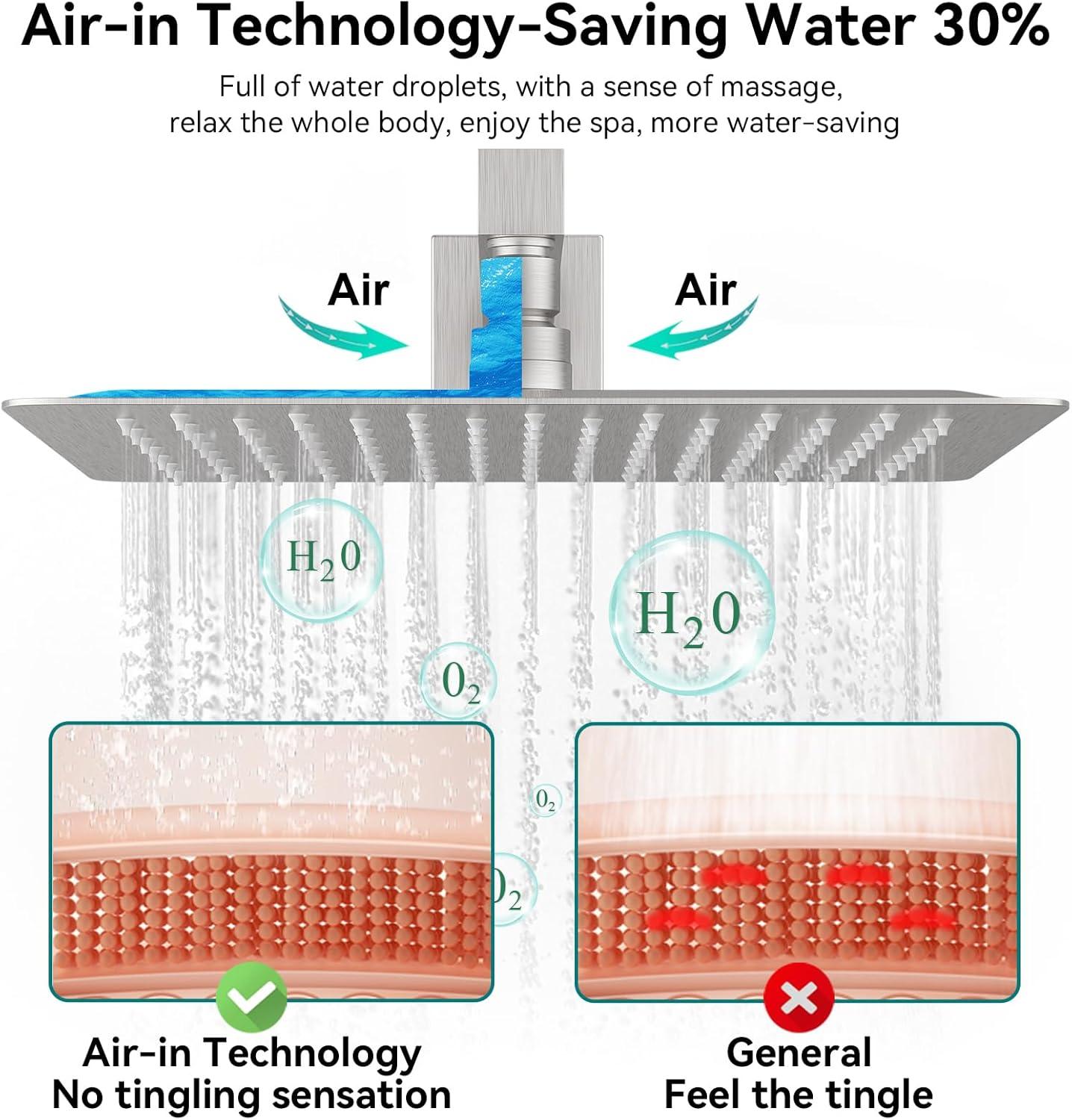High Pressure Rainlall Shower Head: Using cutting-edge air injection technology, this rainfall shower head blends water with air, doubling the pressure for a natural rain simulation. Our unique process makes it durable and anti-corrosion, without the risk of leak, but it also conserves water more than 30%, and once adjusted, it holds its position firmly