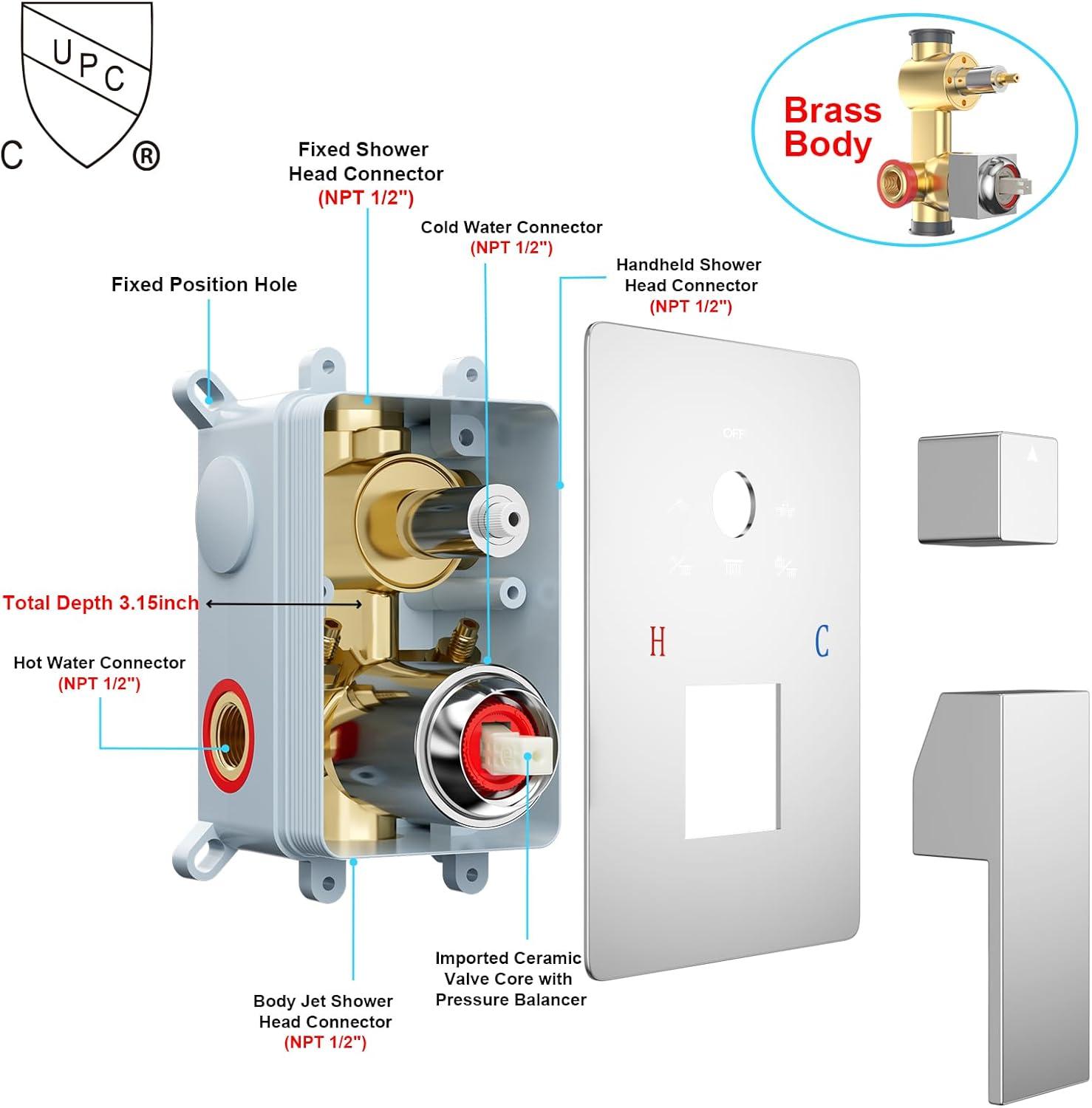 Certified Safety & Standard Connections:This Rain Shower Head and Handle Set it features a cUPC certified pressure balance valve with built-in check valves to monitor water pressure and prevent scalding, approved by the California Energy Commission for standard 1/2-inch US pipe connections