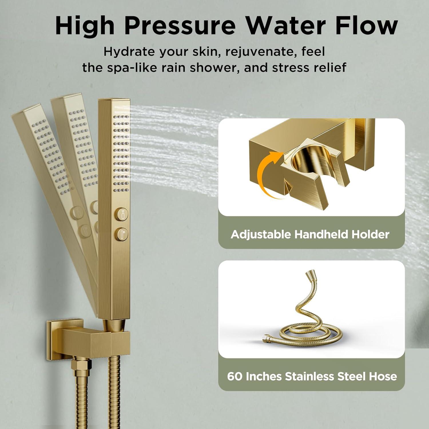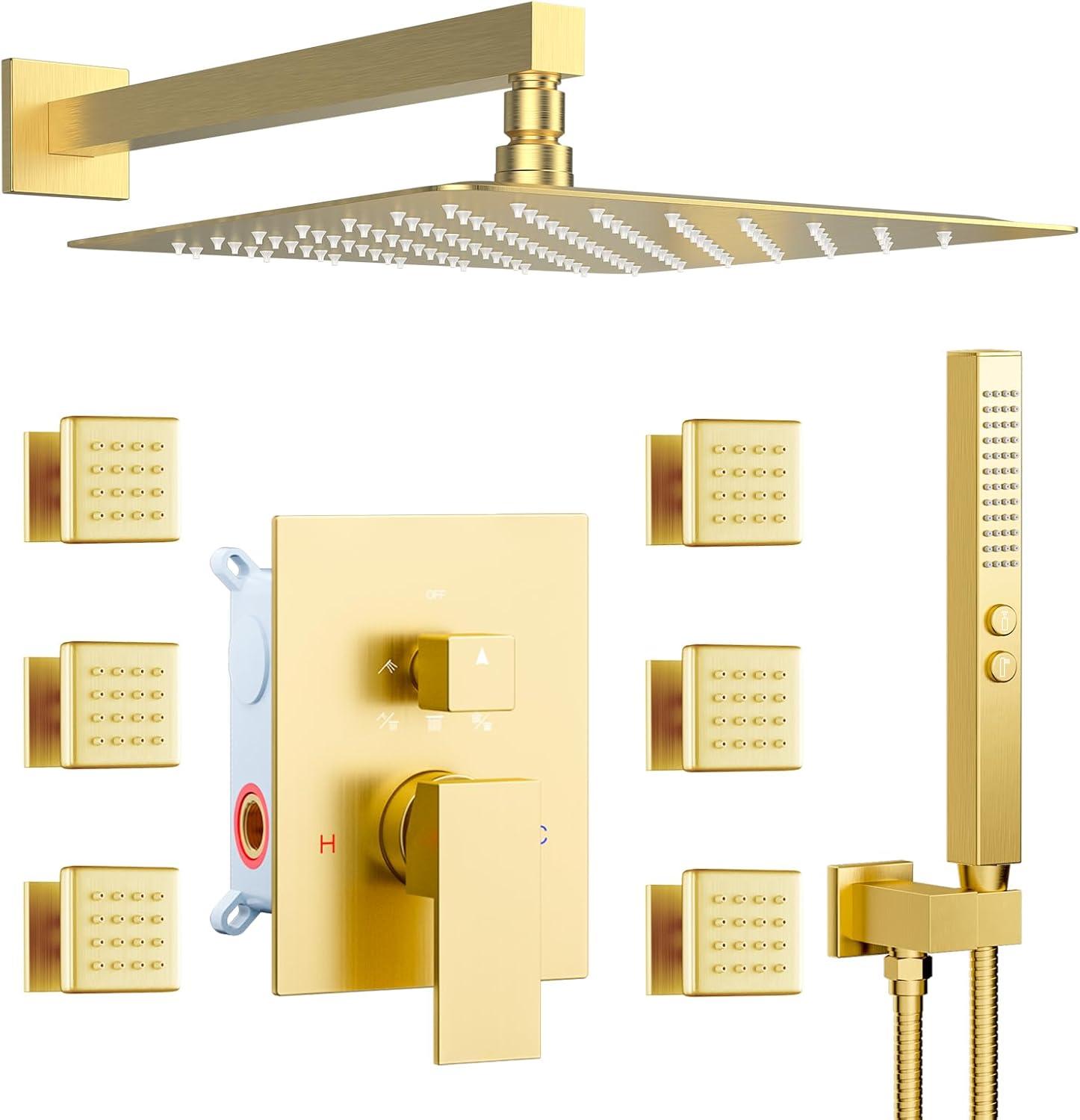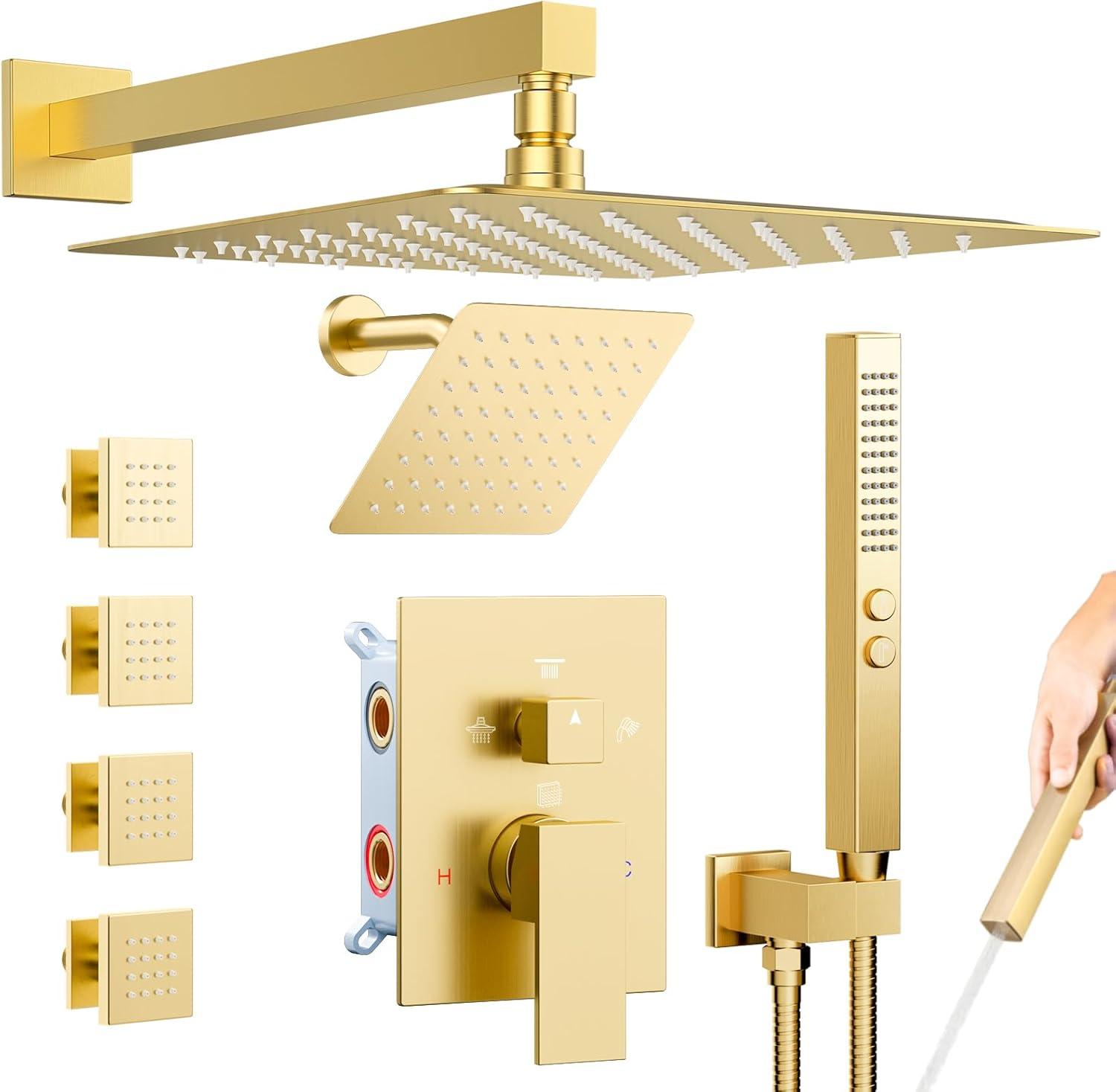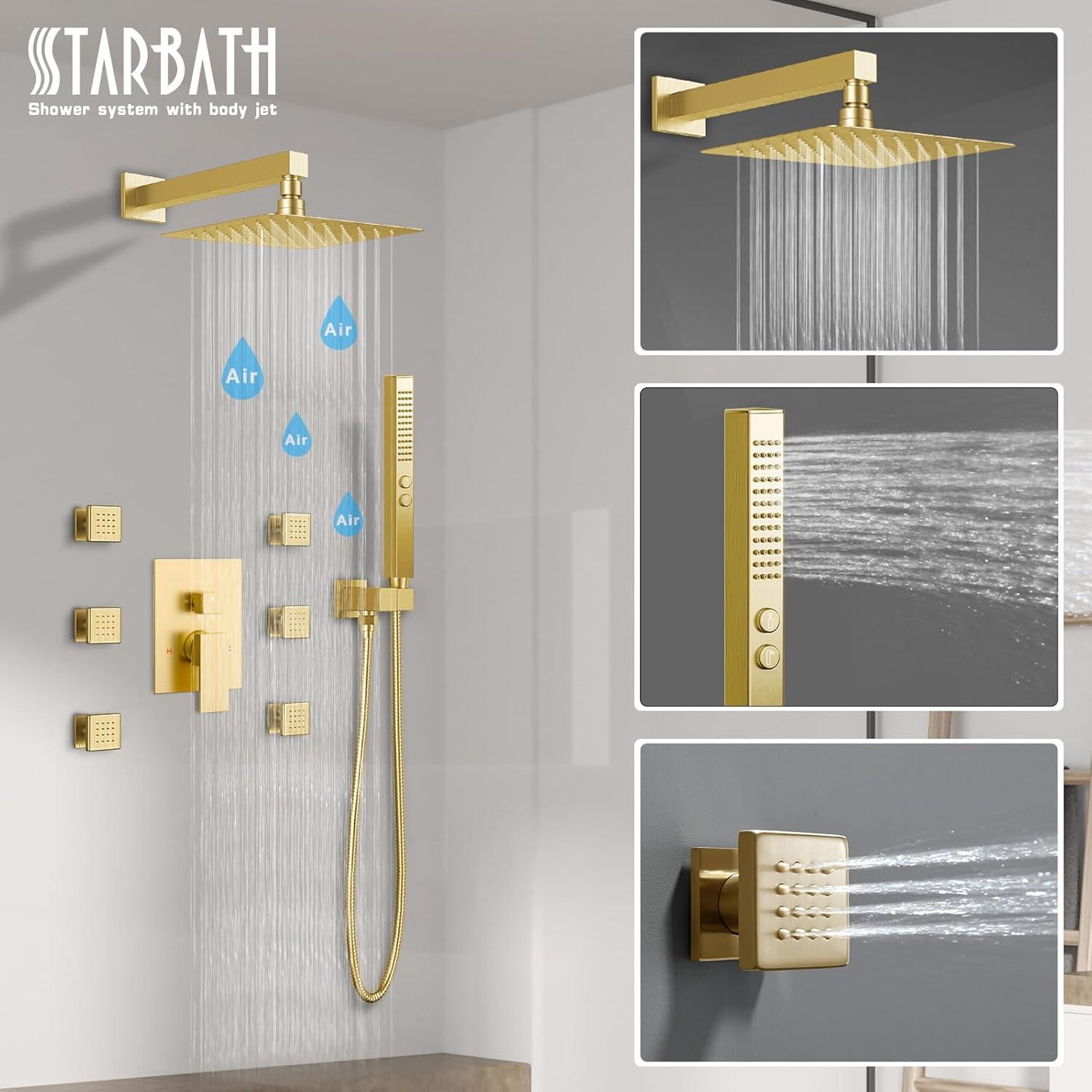 Shower System with 4 Body Spray Jets, STARBATH 4 Way 12 + 6"Rainfall Shower Head with Handheld Combo, Wall Mounted Shower Jets System in Wall Shower Faucet Set, Brushed Gold(Gold)