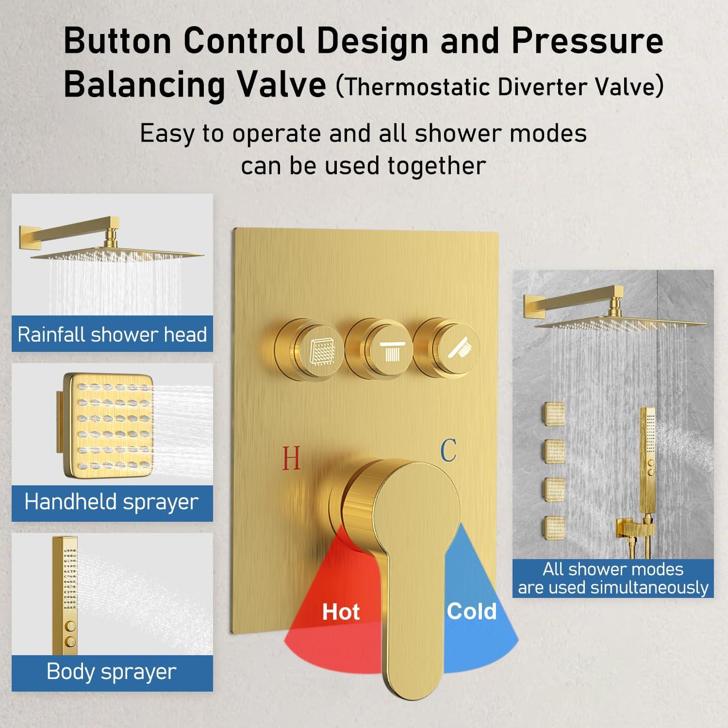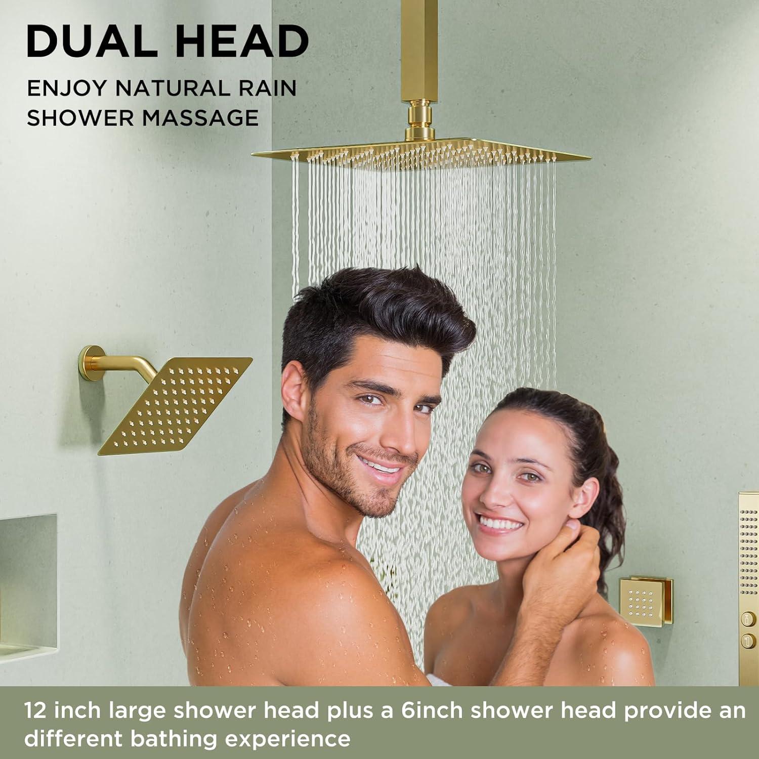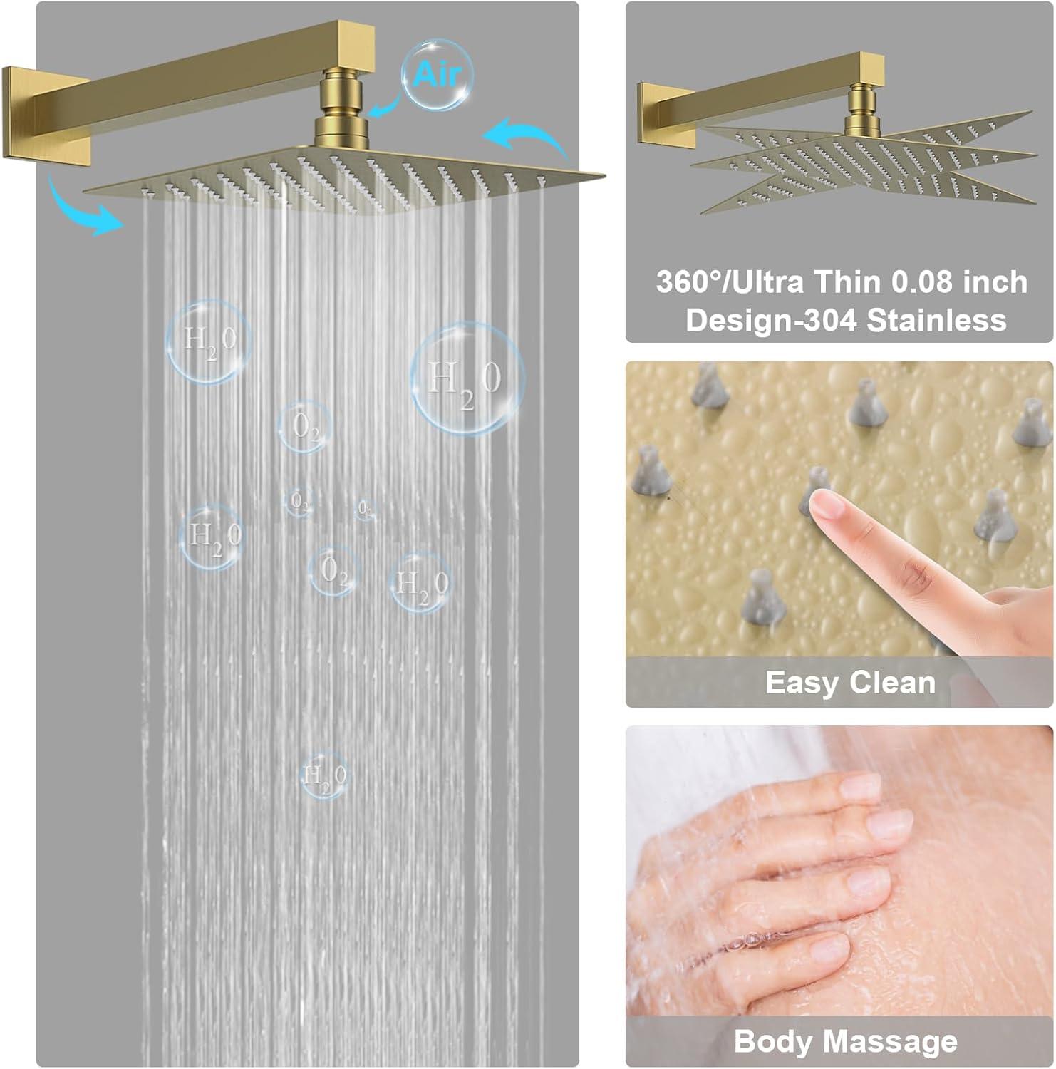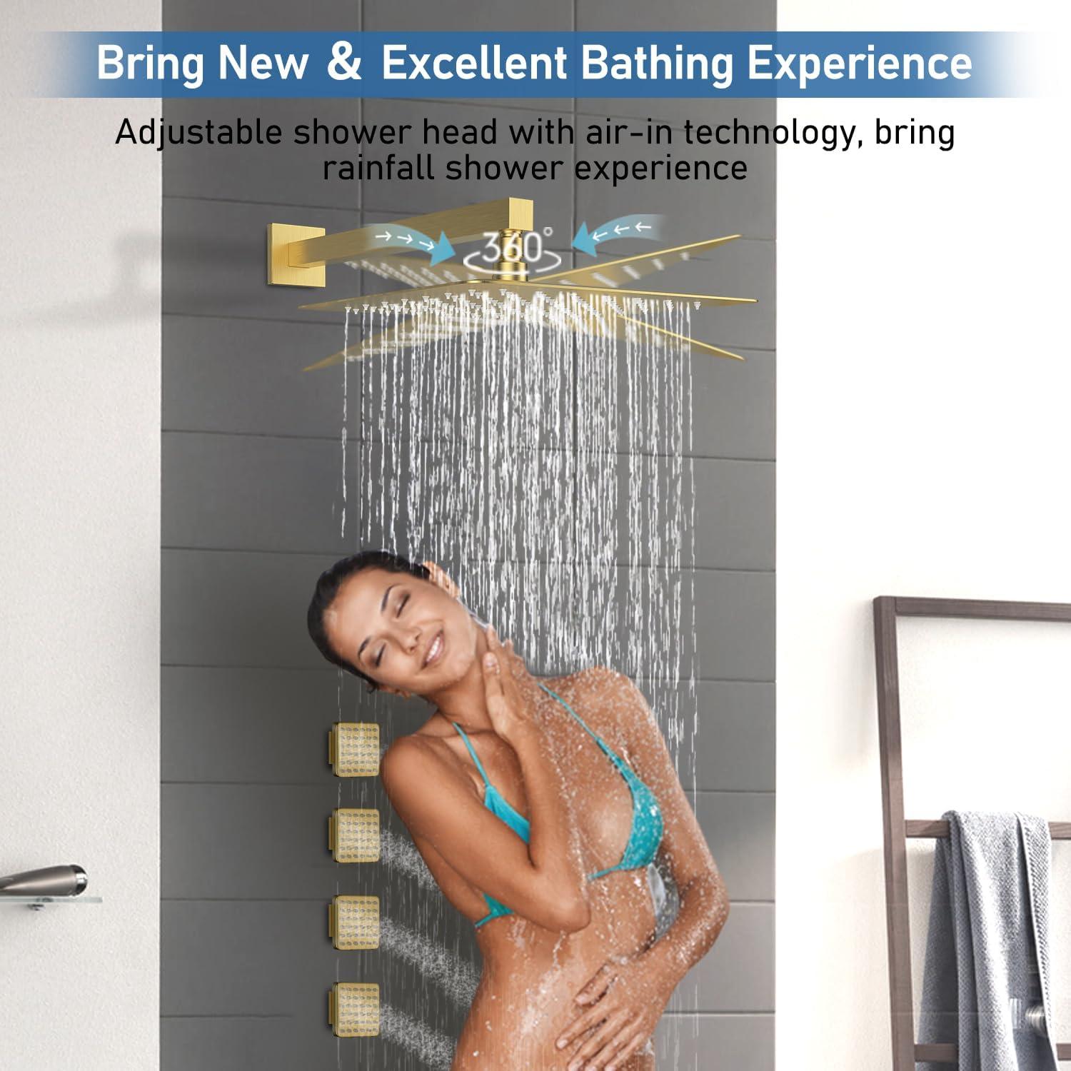Shower System with 4 Body Spray Jets, STARBATH 4 Way 12 + 6"Rainfall Shower Head with Handheld Combo, Wall Mounted Shower Jets System in Wall Shower Faucet Set, Brushed Gold(Gold)