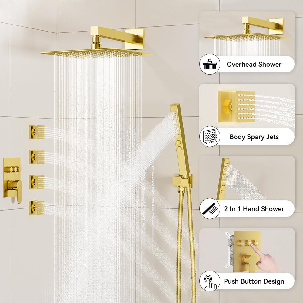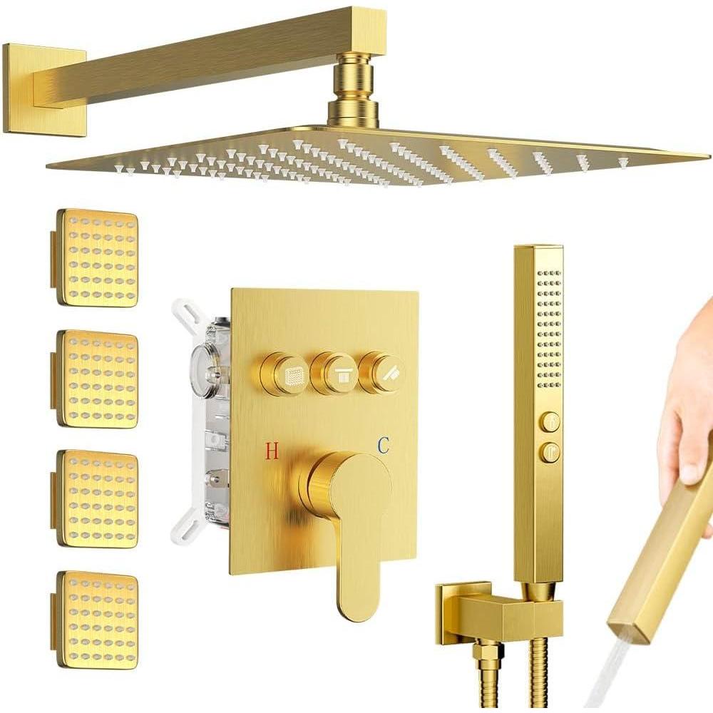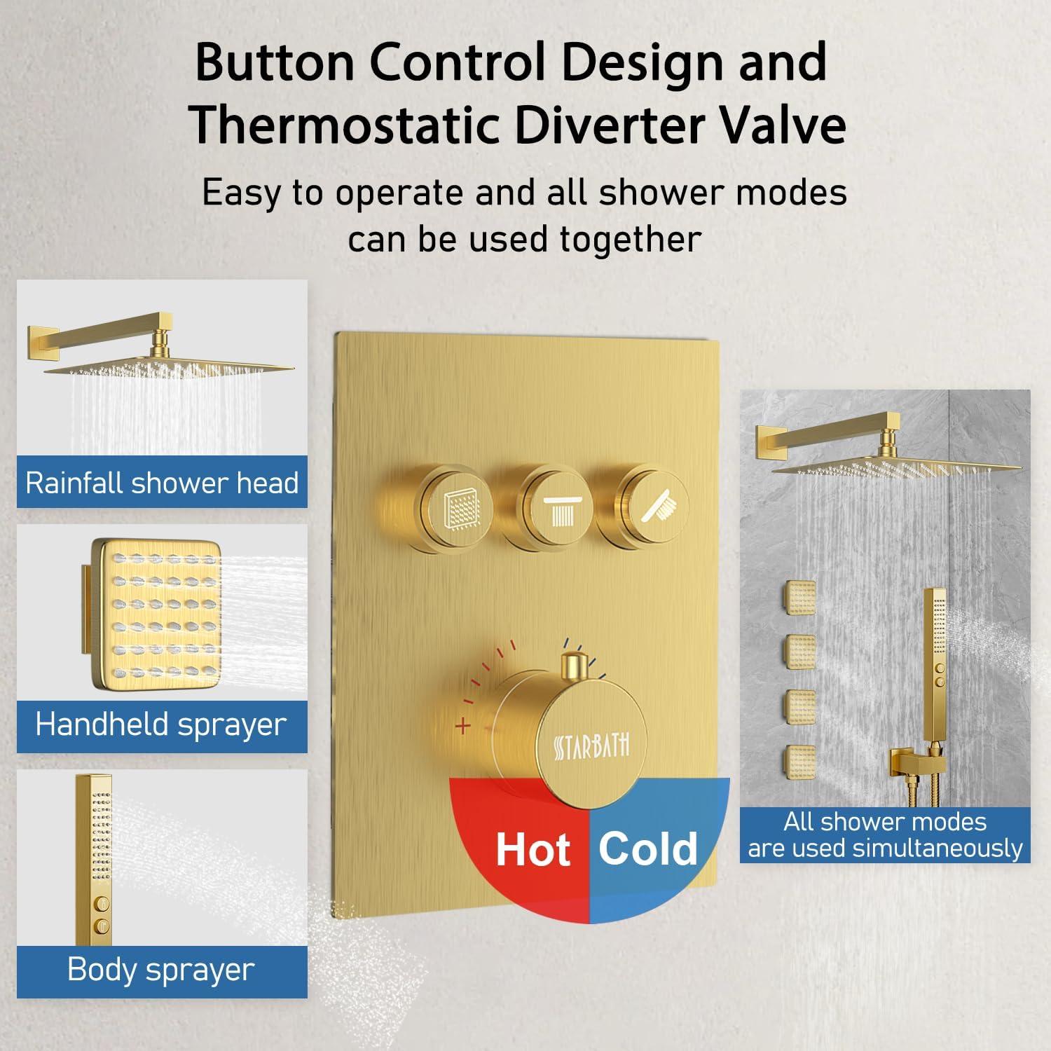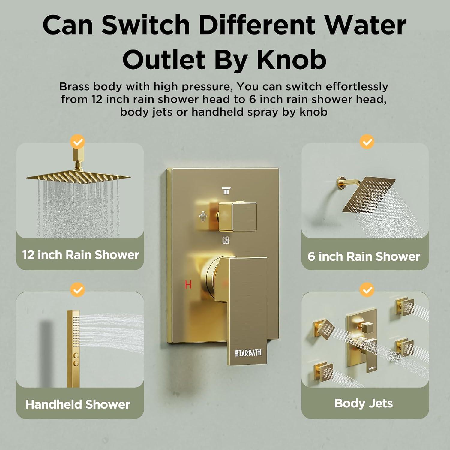 imageShower System with 4 Body Spray Jets STARBATH 4 Way 12  6quotRainfall Shower Head with Handheld Combo Wall Mounted Shower Jets System in Wall Shower Faucet Set Brushed GoldMatte Black