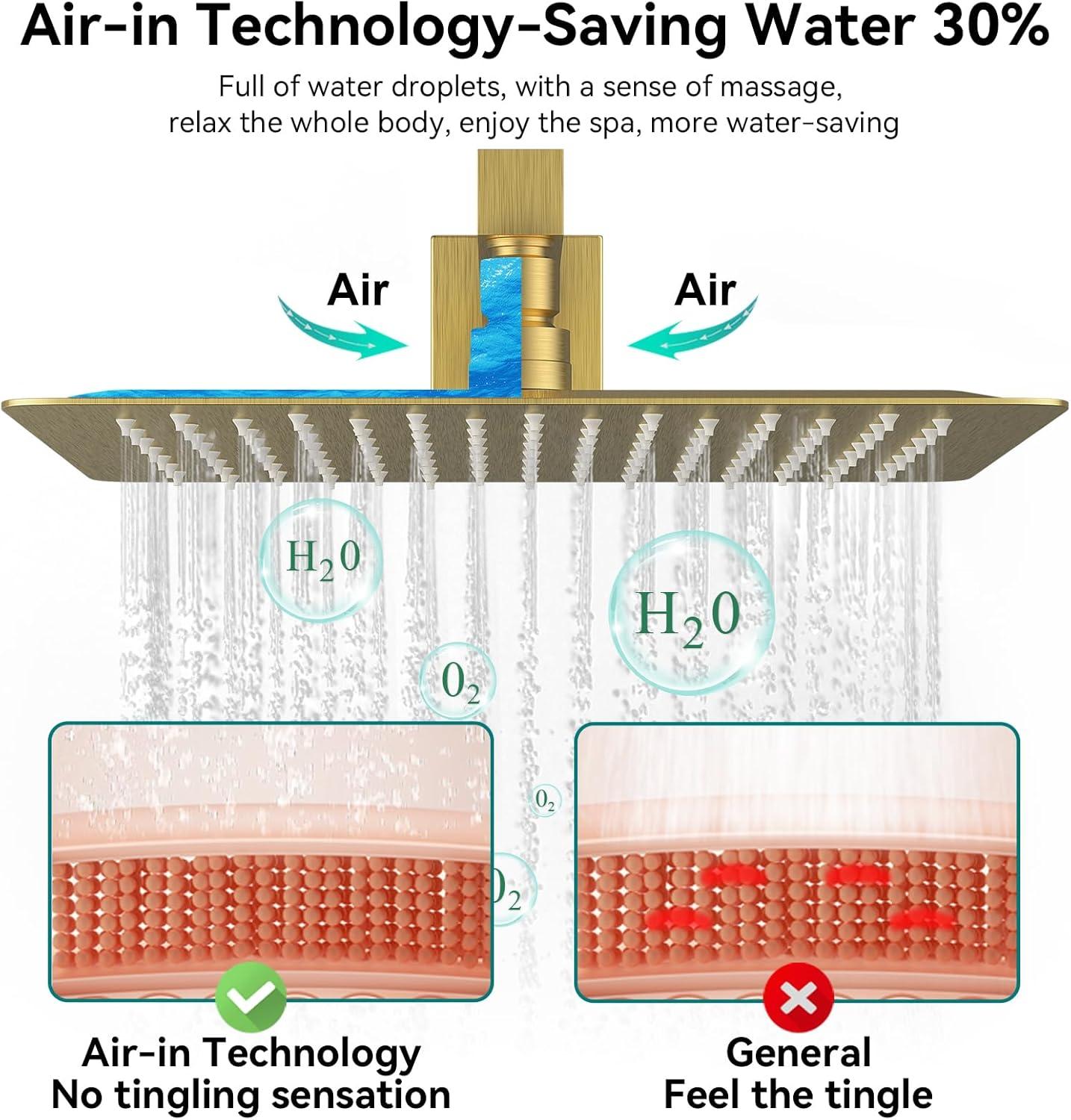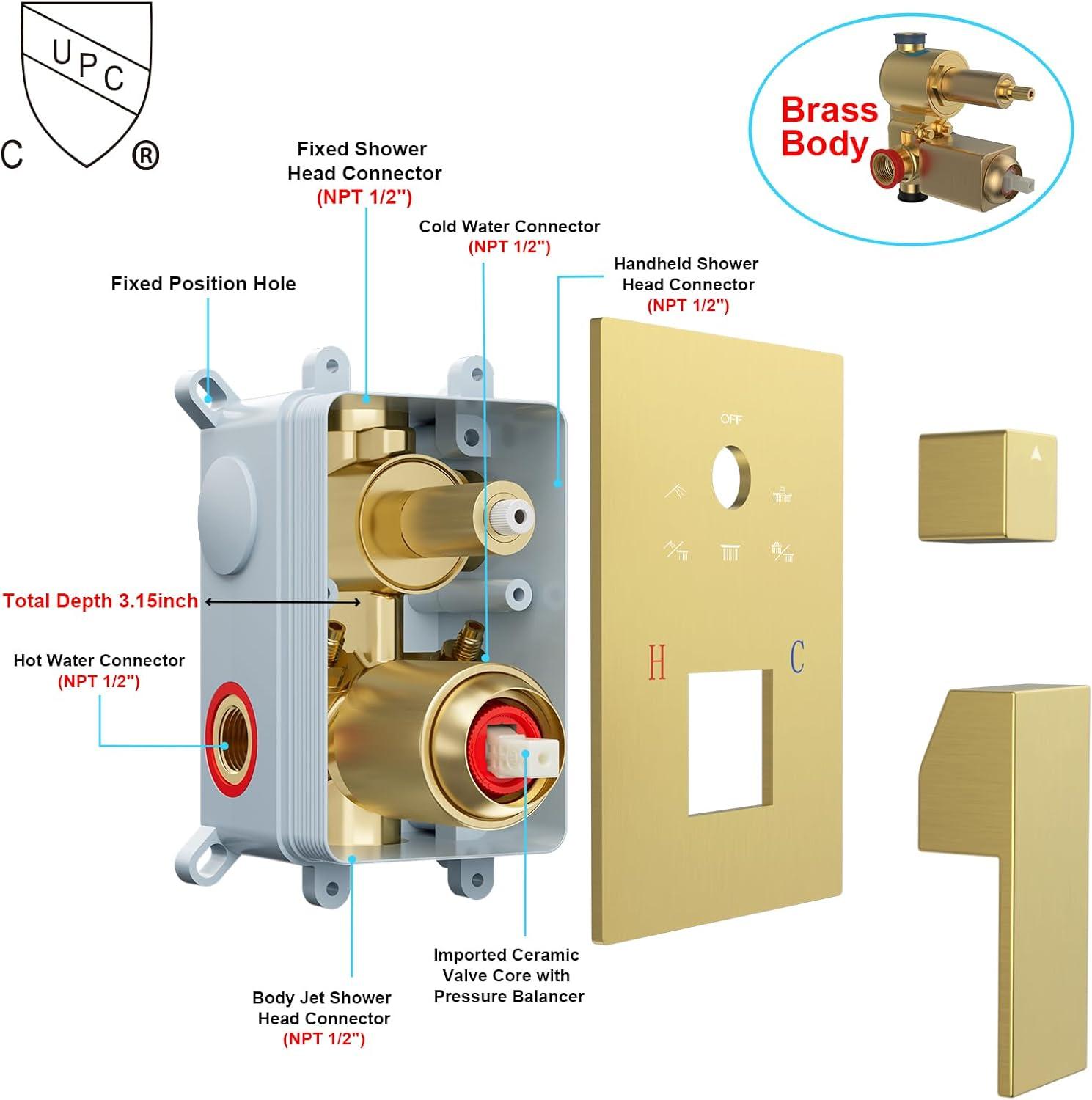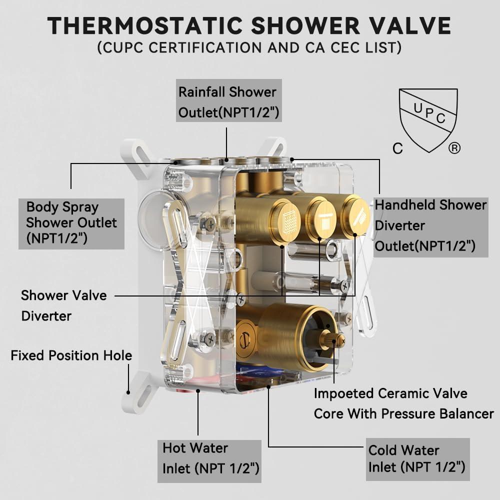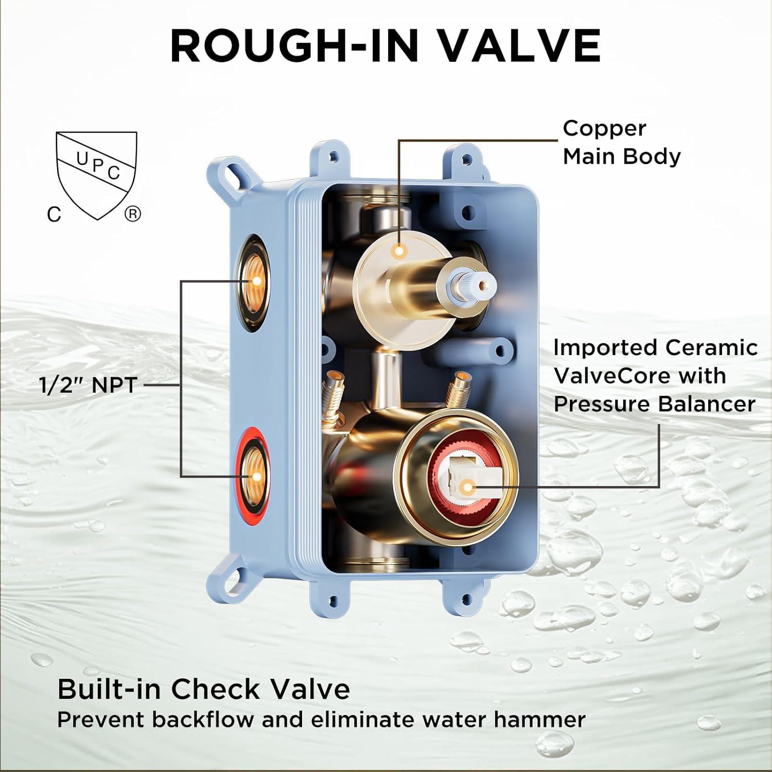 Certified Safety & Standard Connections:This Rain Shower Head and Handle Set it features a cUPC certified pressure balance valve with built-in check valves to monitor water pressure and prevent scalding, approved by the California Energy Commission for standard 1/2-inch US pipe connections