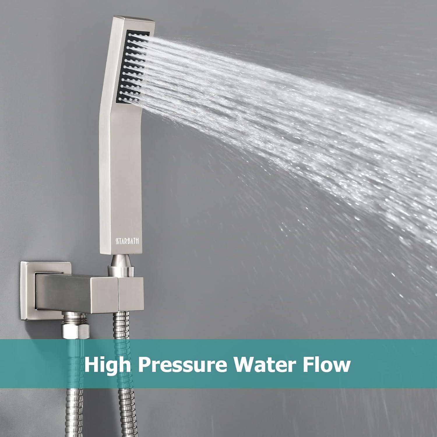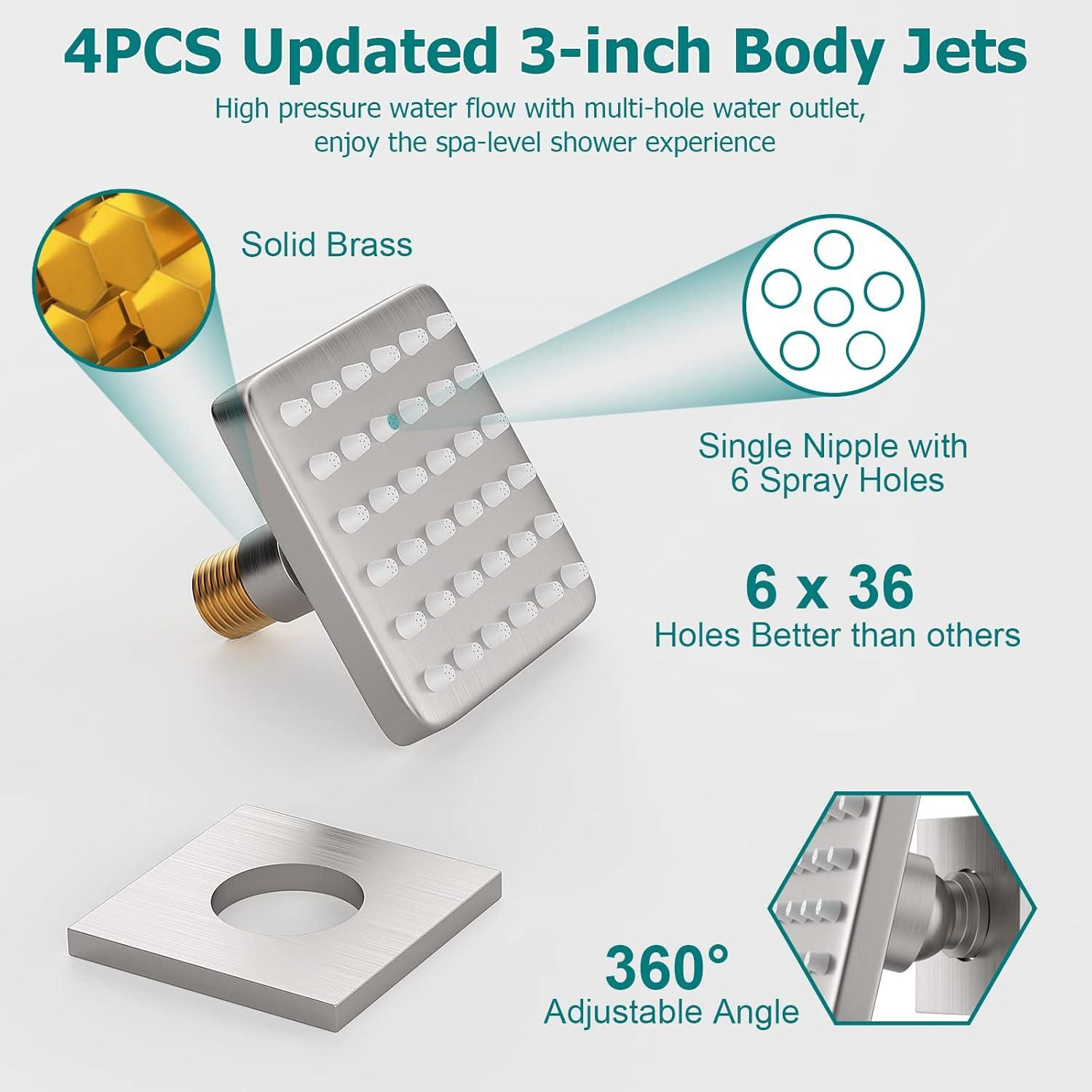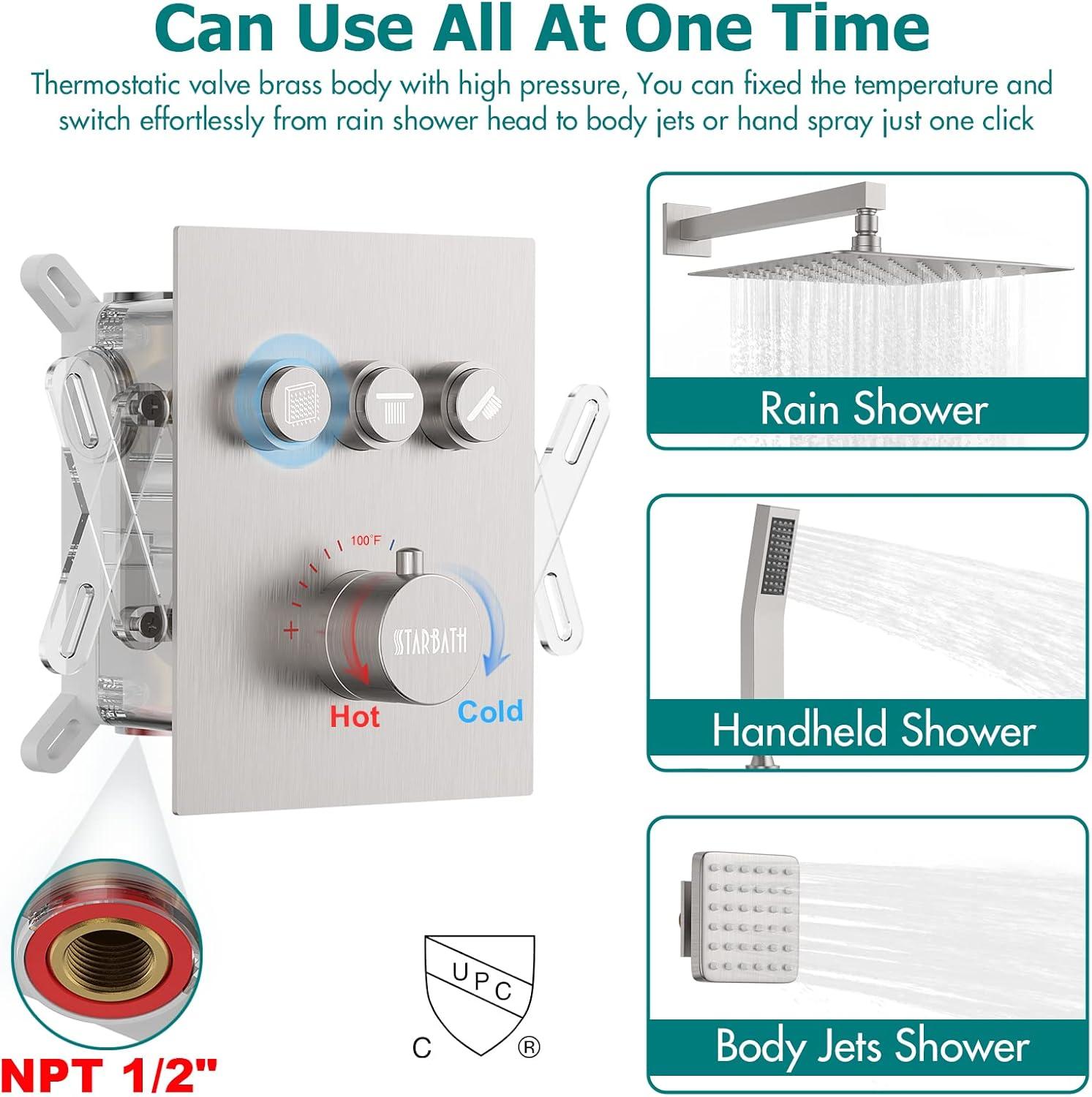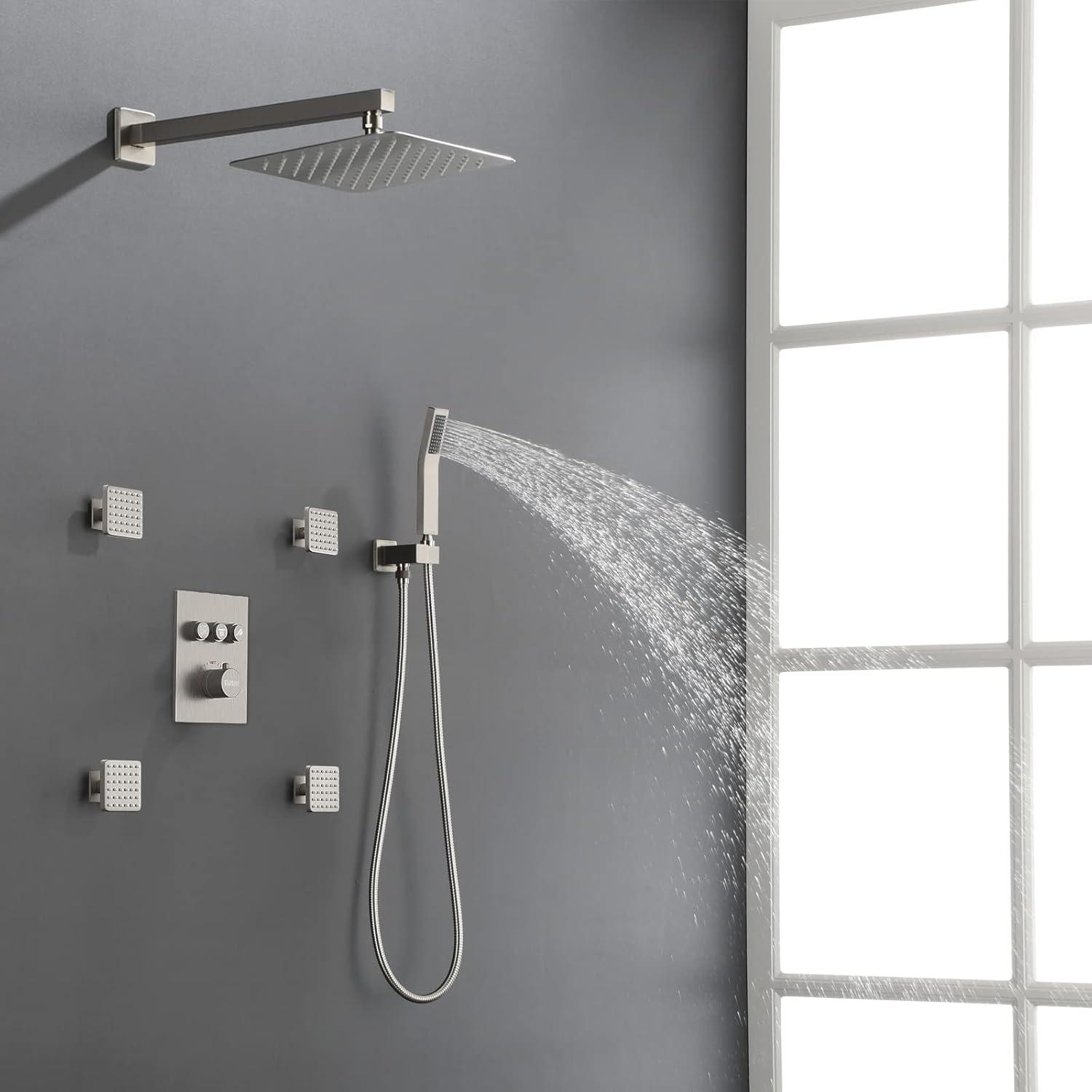 Shower System with Body Jets: 12-inch Square Rain Shower Head (304 stainless steel) with 16-inch Shower Arm (Brass), Handheld Spray(Brass), Shower Holder (Brass), 60-inch Shower Hose (304 stainless steel), 4pcs 3-inch Body Jets, Thermostatic Valve (Brass), Our product brass content is higher than others, corrosion-resistant and more durable